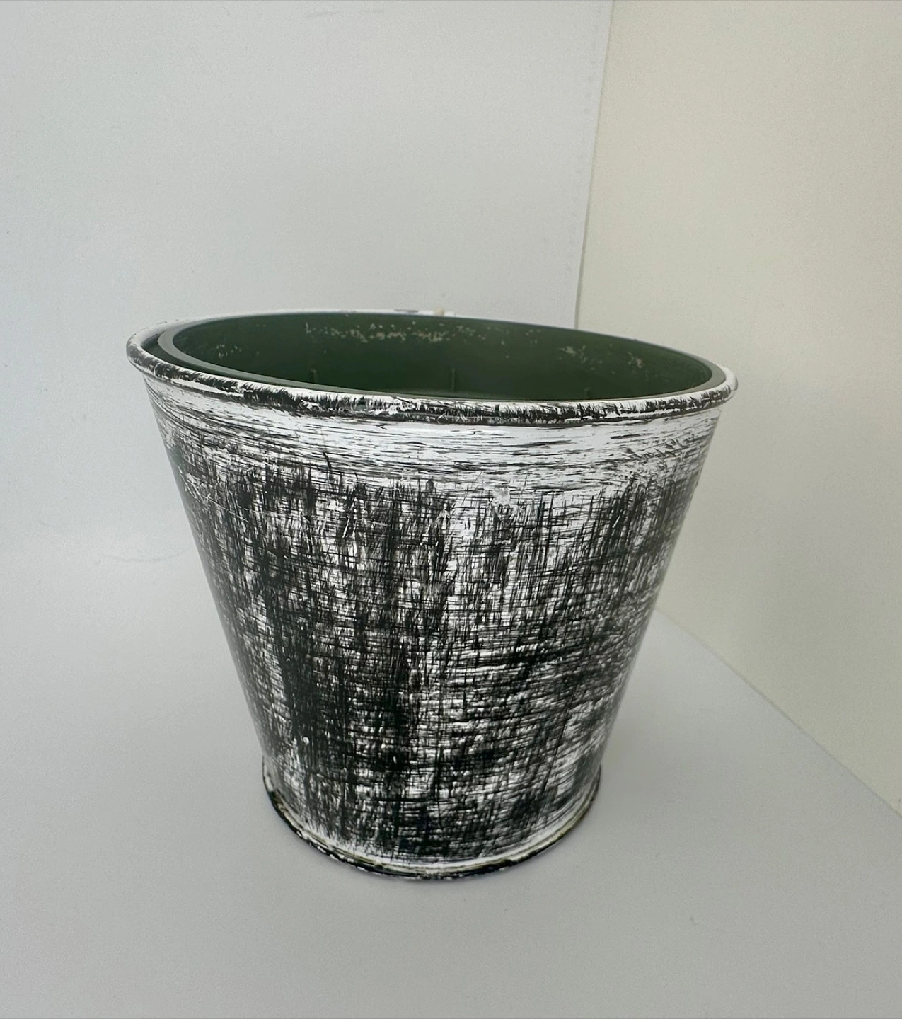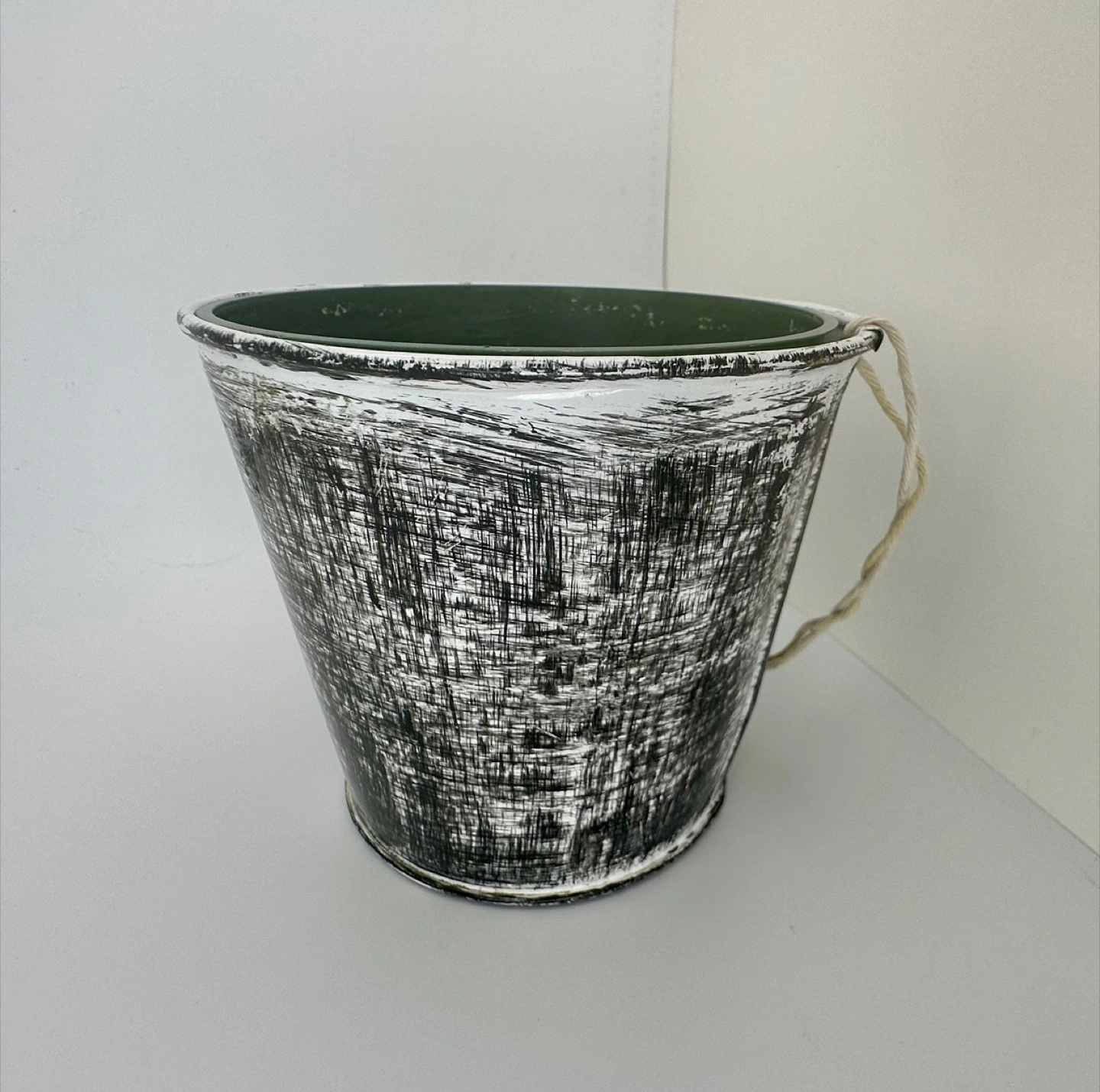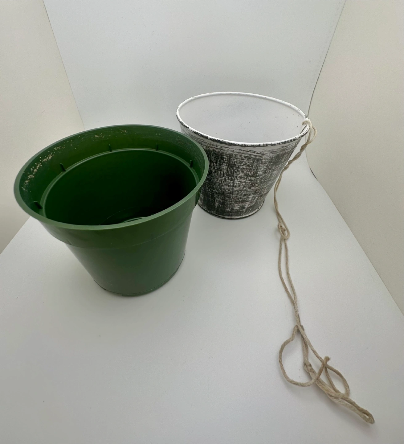 Black and white distressed finish with a hole for hanging using a rope or string. Comes with a green 3.75-inch plastic nursery pot insert. Perfect for small plants or flowers—especially striking with pink or light-toned greenery.
