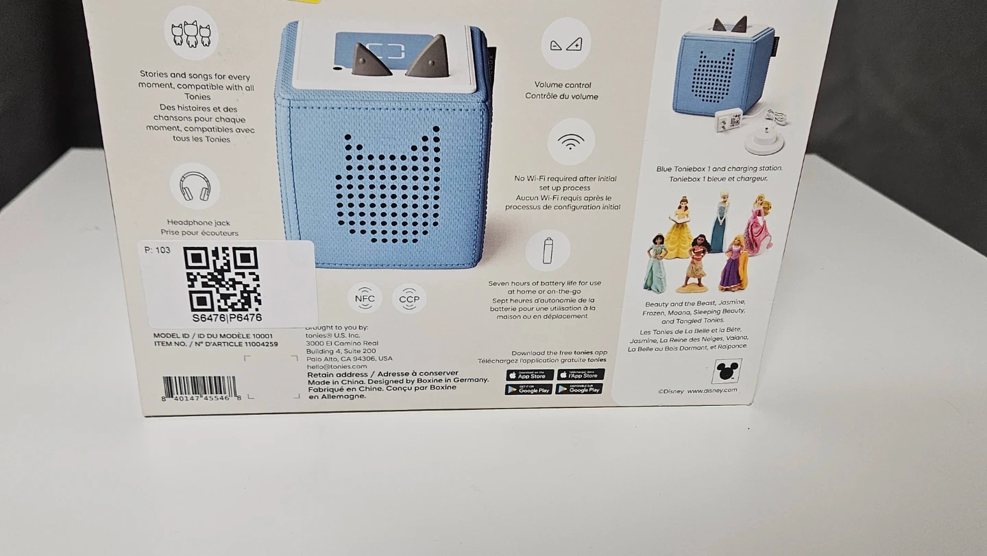 This bundle includes the blue Toniebox and 6 Disney Princess Tonies. Stories and songs play from the Toniebox when a Tonie figure is placed on top. It has volume control and seven hours of battery life. Perfect for little Disney fans!