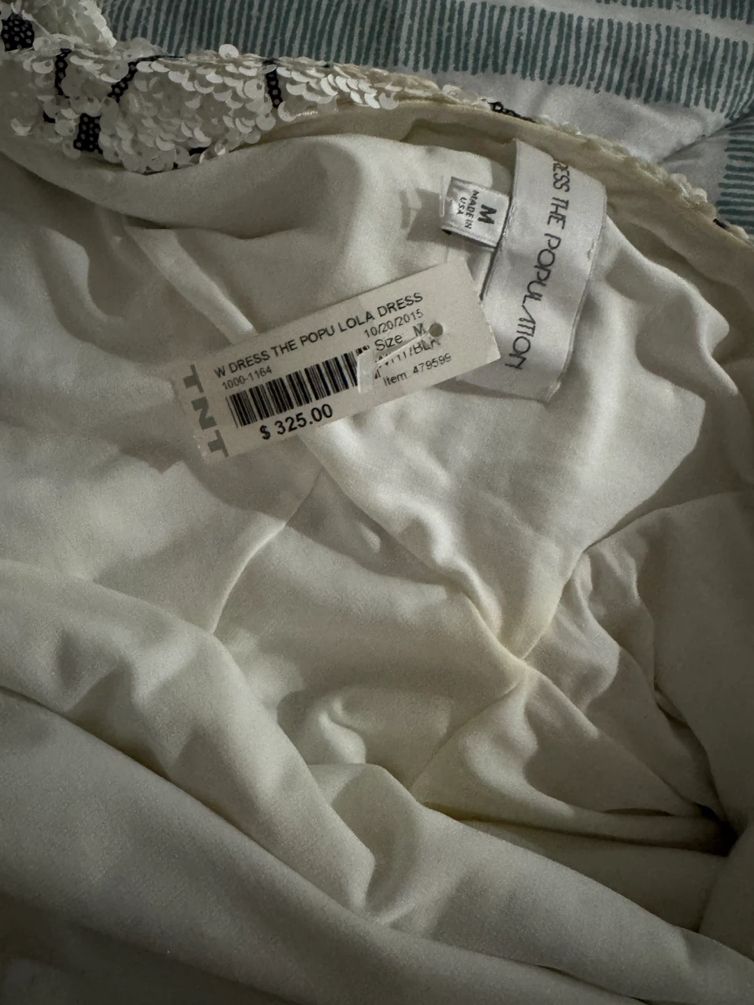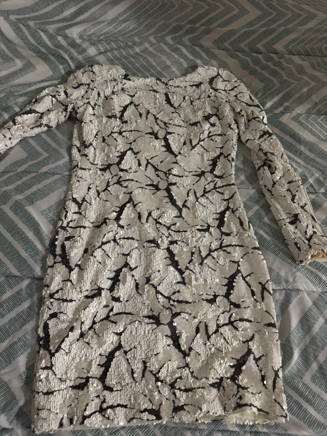 This is a sequined midi dress by The Dress The Popu. It features a long-sleeve design and a striking black and white pattern. Size medium. Perfect for a night out!