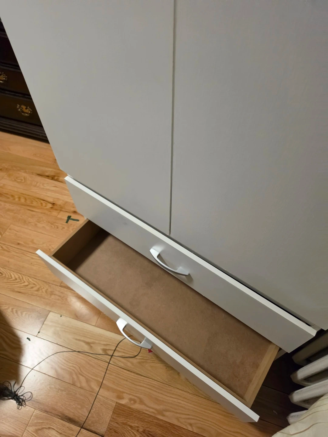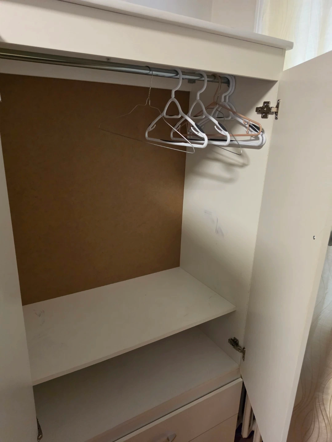 A two-door white wardrobe with a hanging rod and one shelf inside. It also has two drawers at the bottom for extra storage. Perfect for organizing clothes!