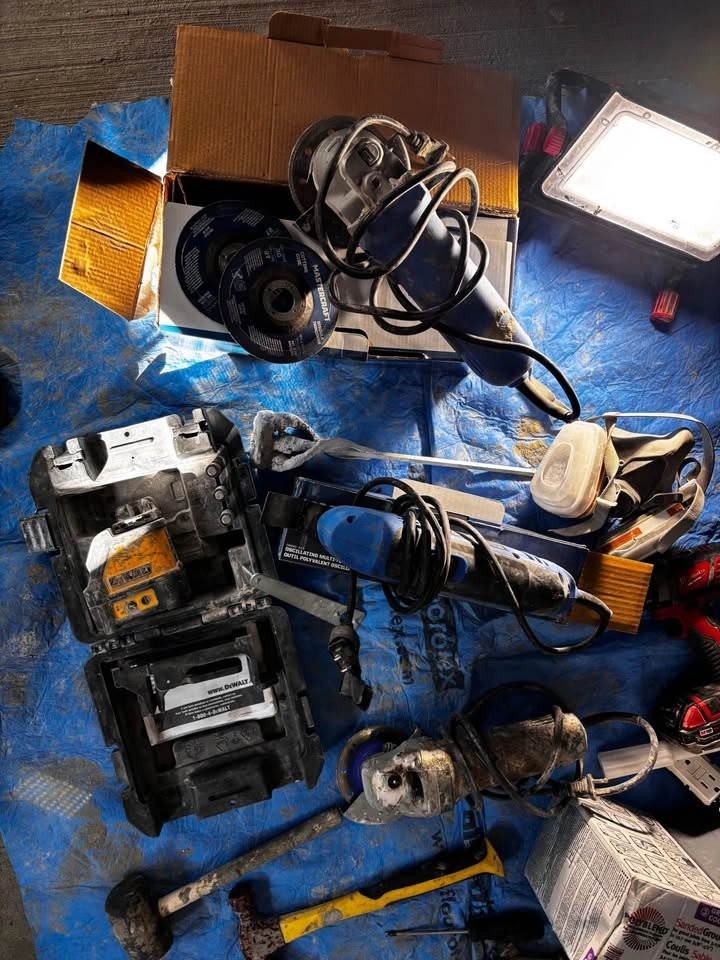 Includes 2 grinders (Bosch and Mastercraft), 1 oscillating multi-tool, heavy-duty work light, Dewalt self-leveling laser, screwdrivers, 2 notched trowels, extension cord, measuring tape, and a large toolbox. All electric tools are in good working condition. Urgent sale!