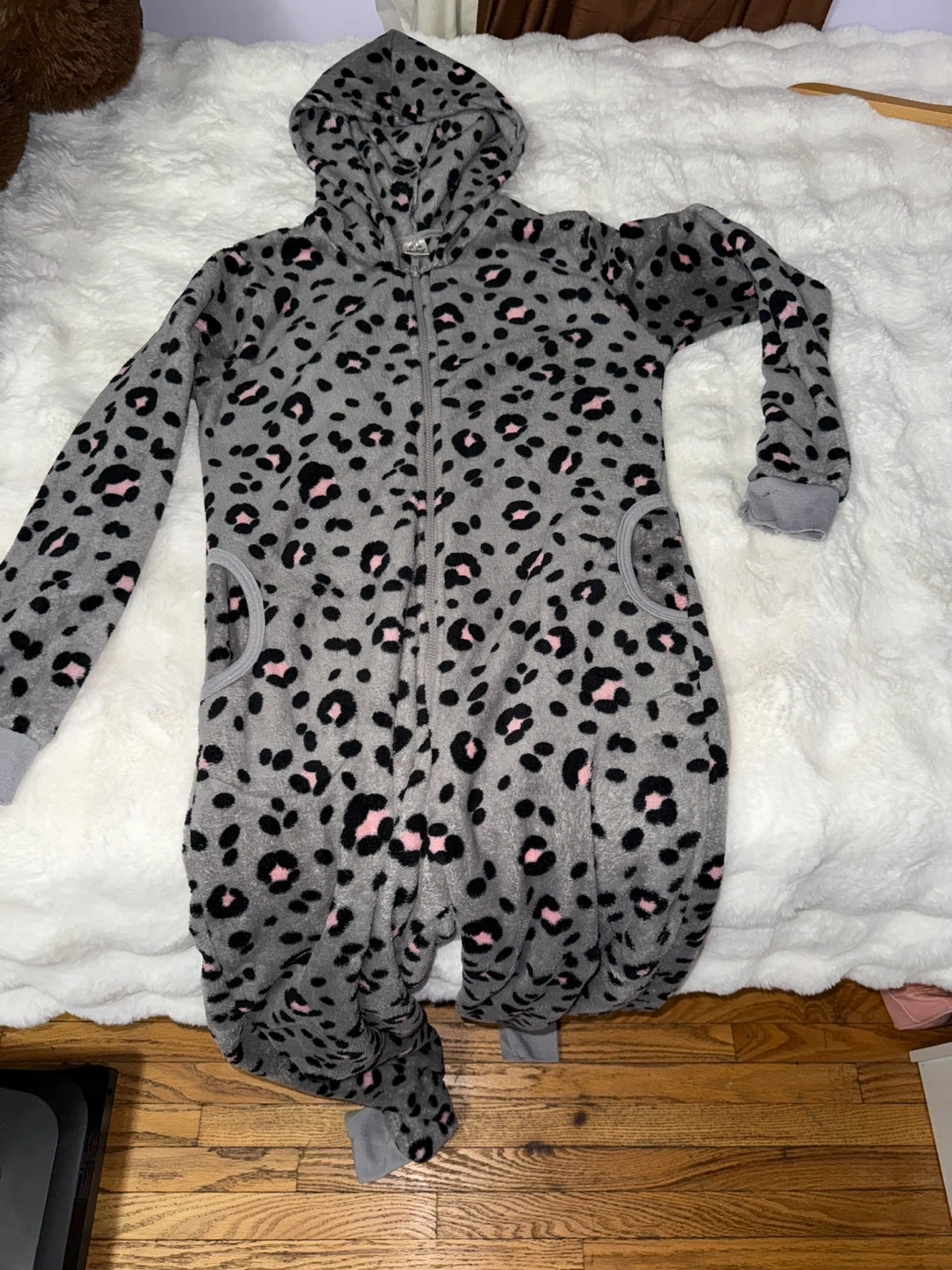 Cozy fleece onesie pajamas for kids with a cute grey leopard print and pink accents. It features a hood and a full zipper closure for easy wear. Made from soft material for maximum comfort.