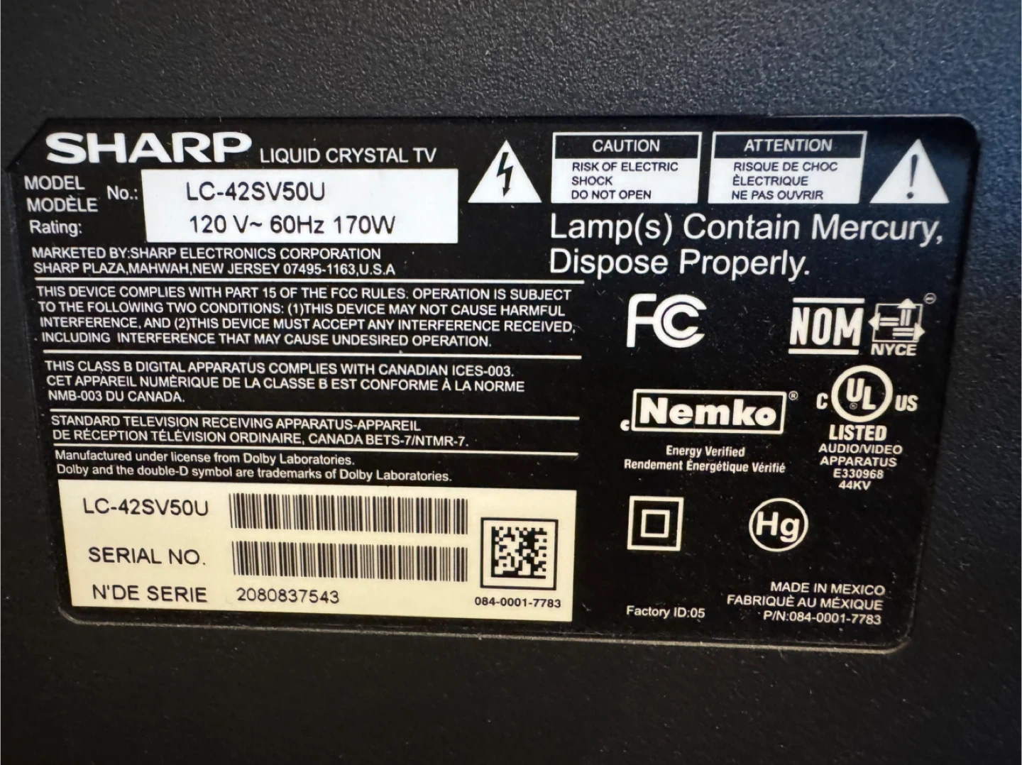 SHARP LC-42SV50U 42-inch Liquid Crystal TV. It has multiple inputs including HDMI, PC, and Component Video