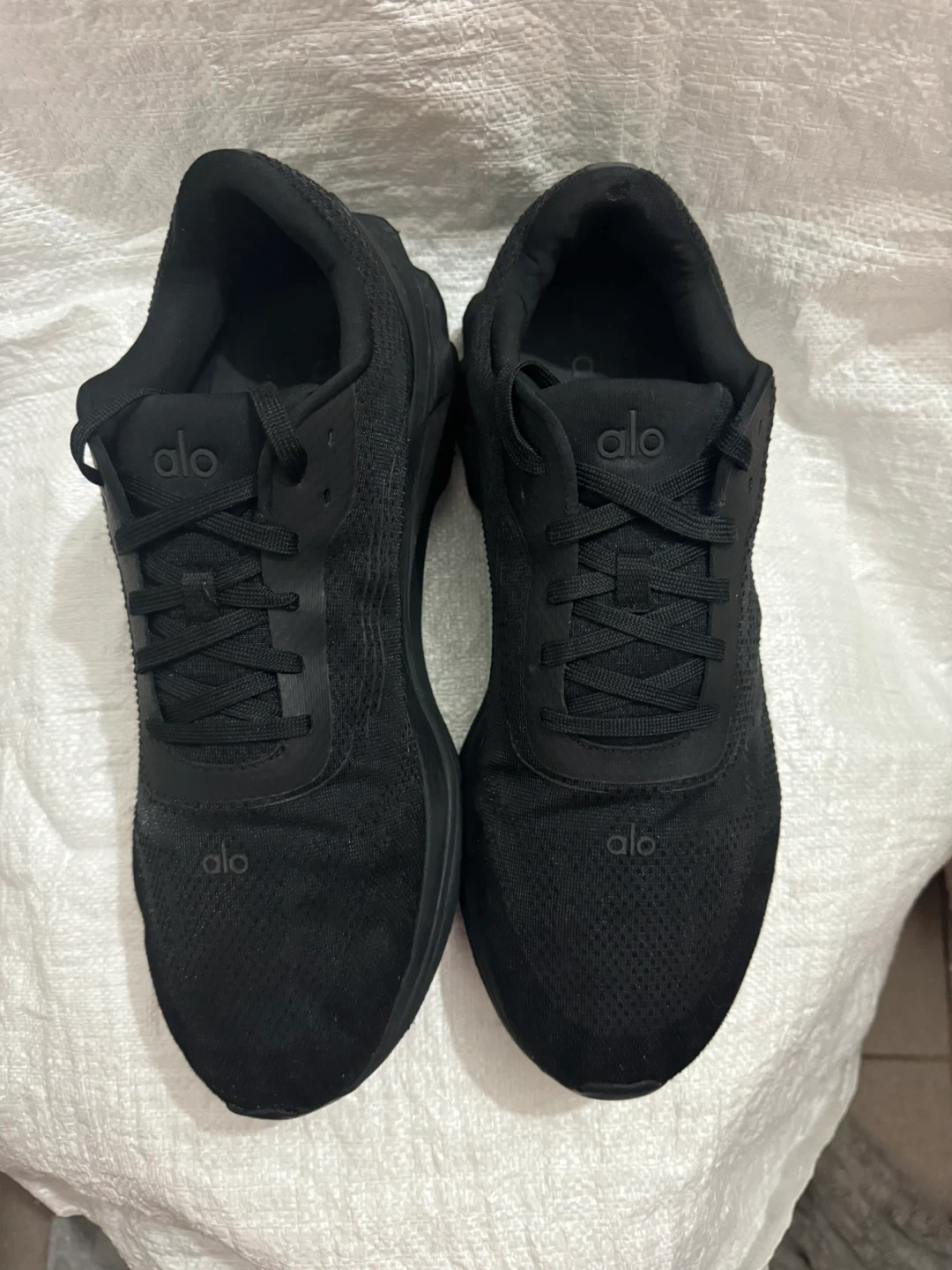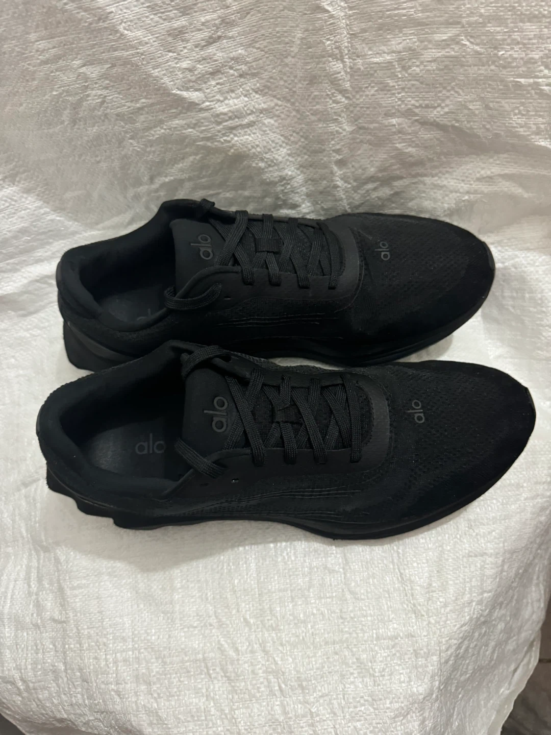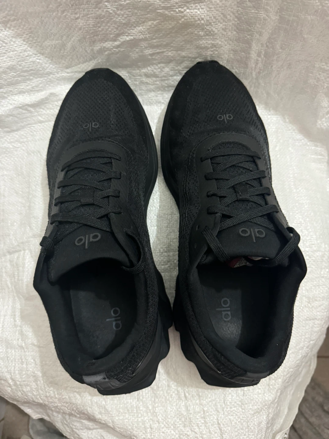 These are black Alo running shoes. They feature a breathable mesh upper and a supportive sole. Good for workouts or casual wear!