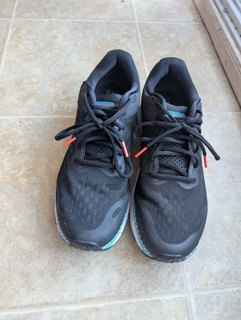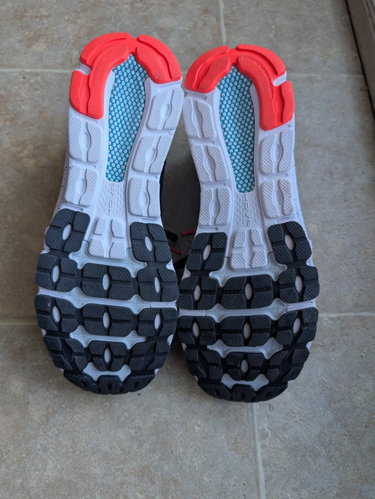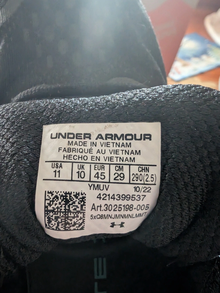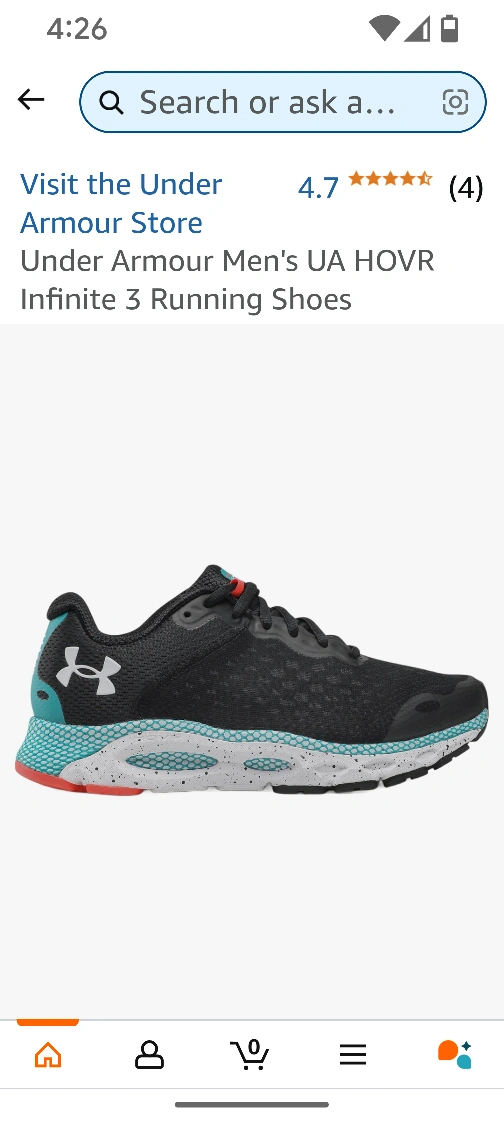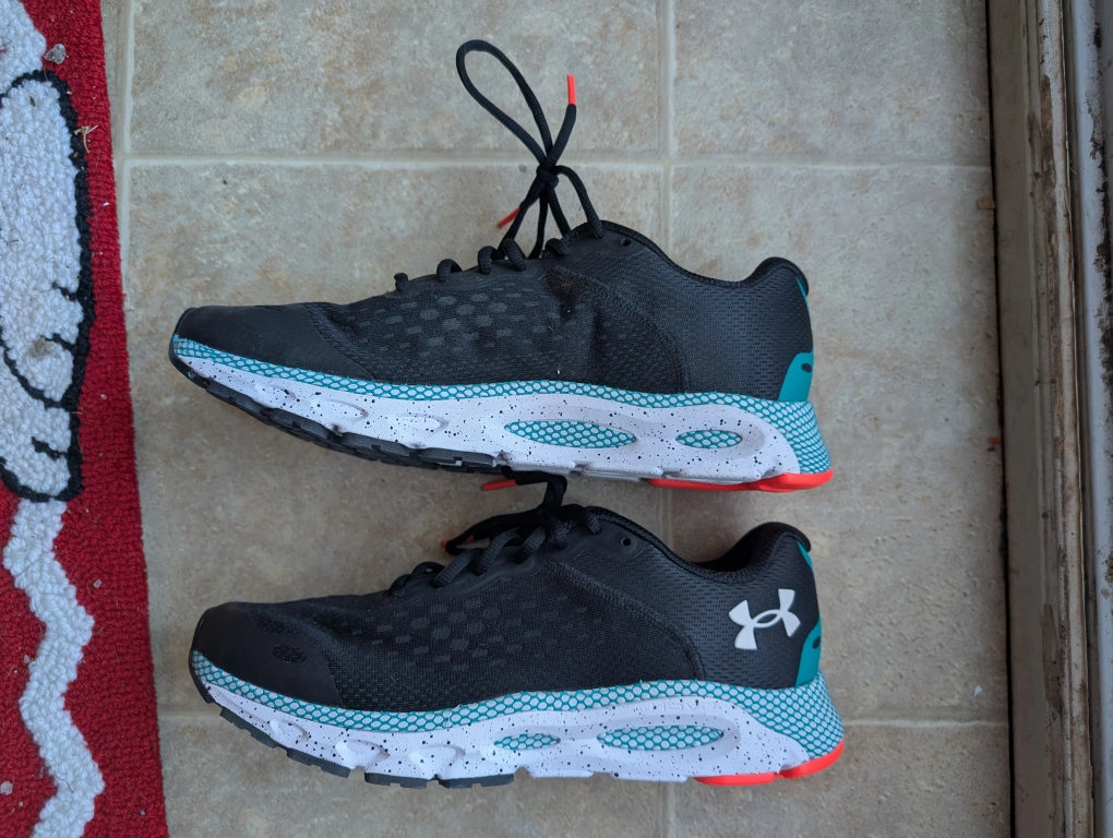Under Armour Hovr Infinite 3 running shoes. Men's size 11. Black with teal and orange accents. Worn once around the house and then forgotten.Responsive UA HOVR cushioning reduces impact, returns energy & helps propel you forward Engineered mesh upper is extremely lightweight & breathable, with strategic support where you need it Internal heel counter for additional support that helps keep the back of the foot locked-in place
