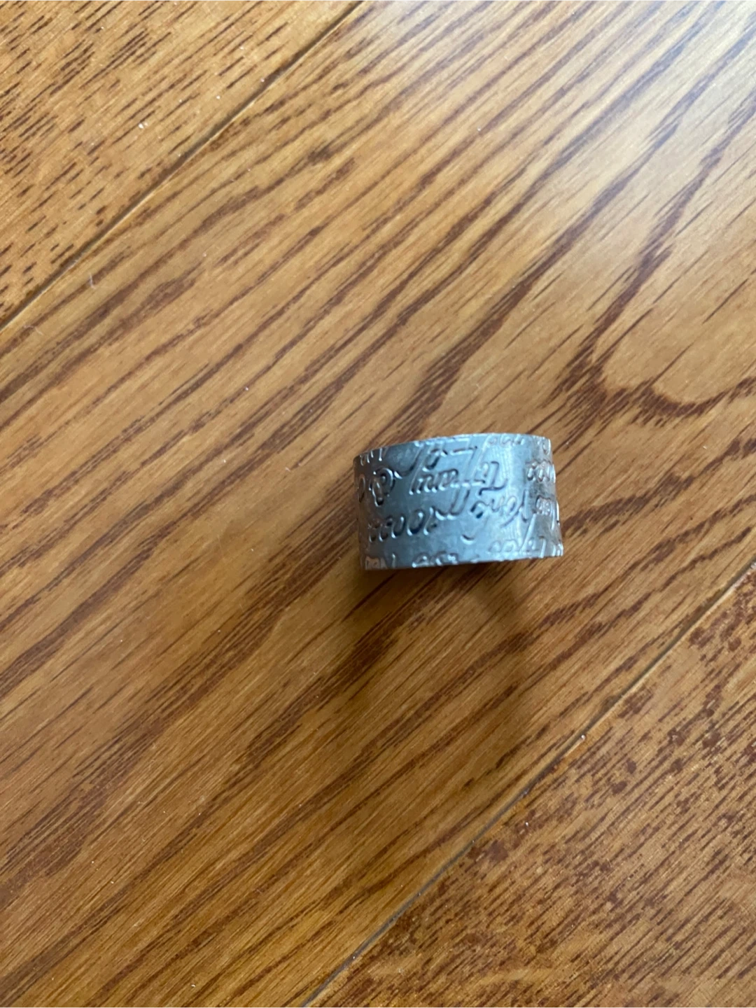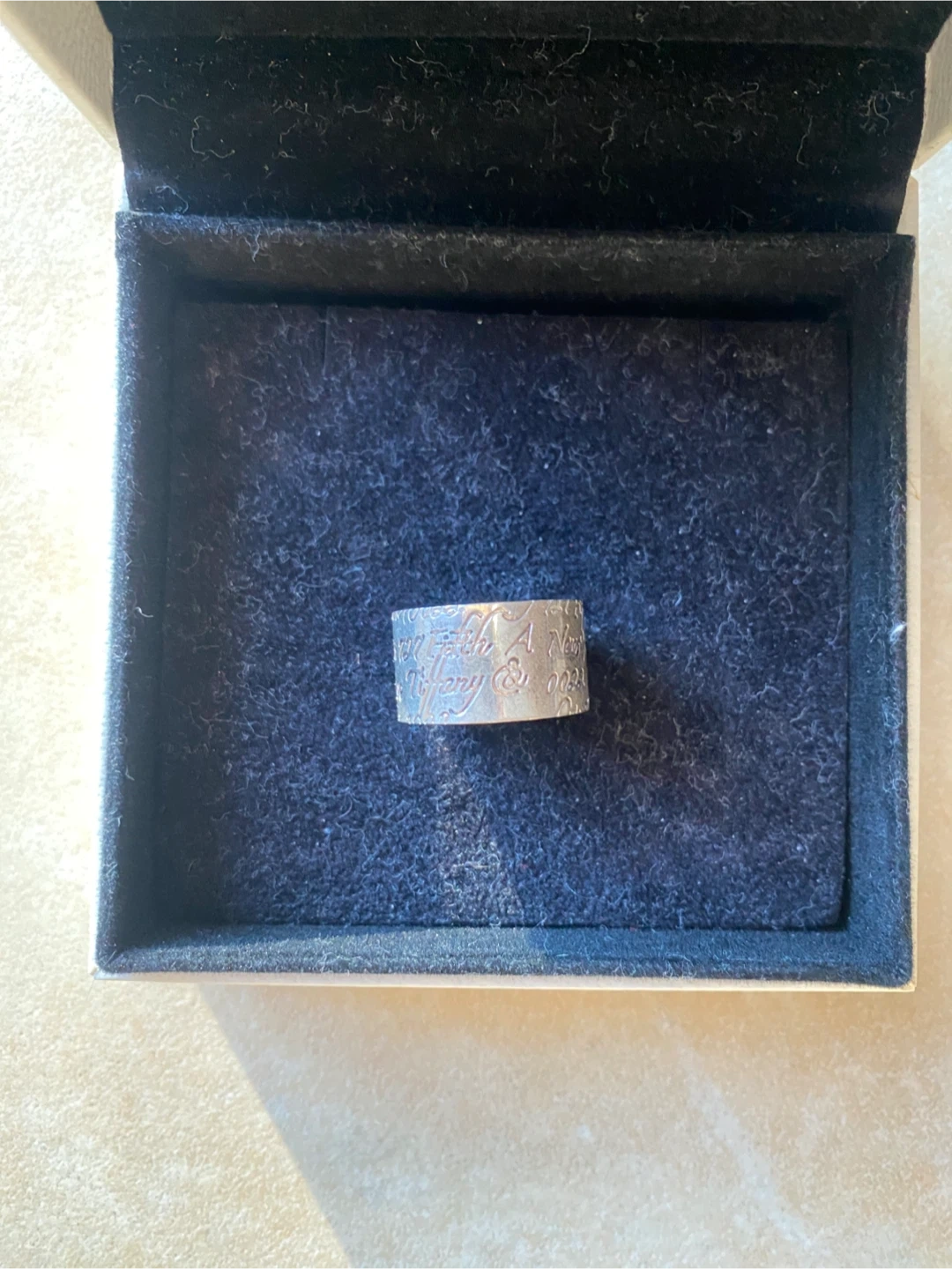 This is a beautiful Tiffany Wide Band ring with engraved text all around. Comes with original box, pouch and gift bag.