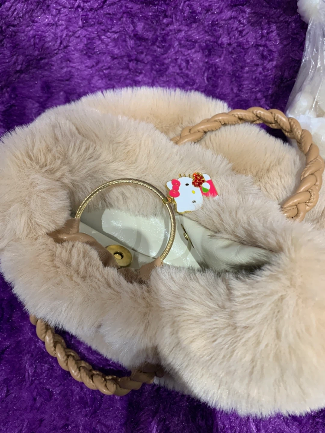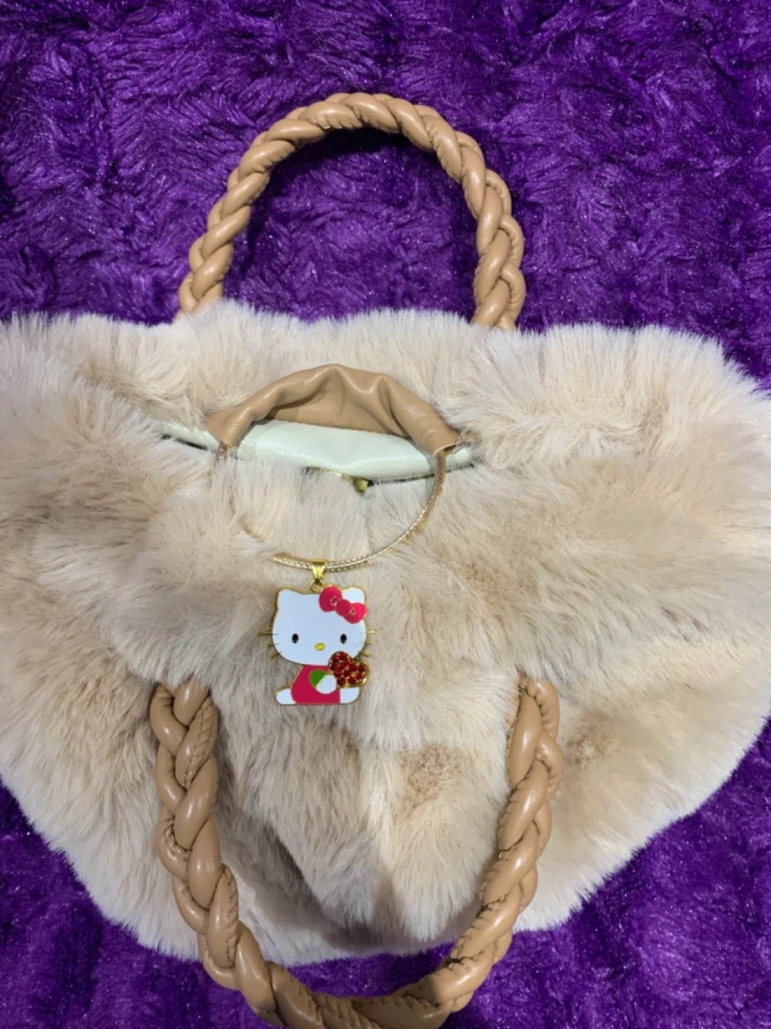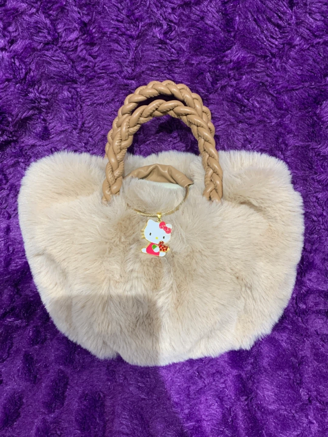 Cream-coloured faux fur handbag with braided faux leather handles. It features a cute Hello Kitty charm with a red heart. Interior is lined.