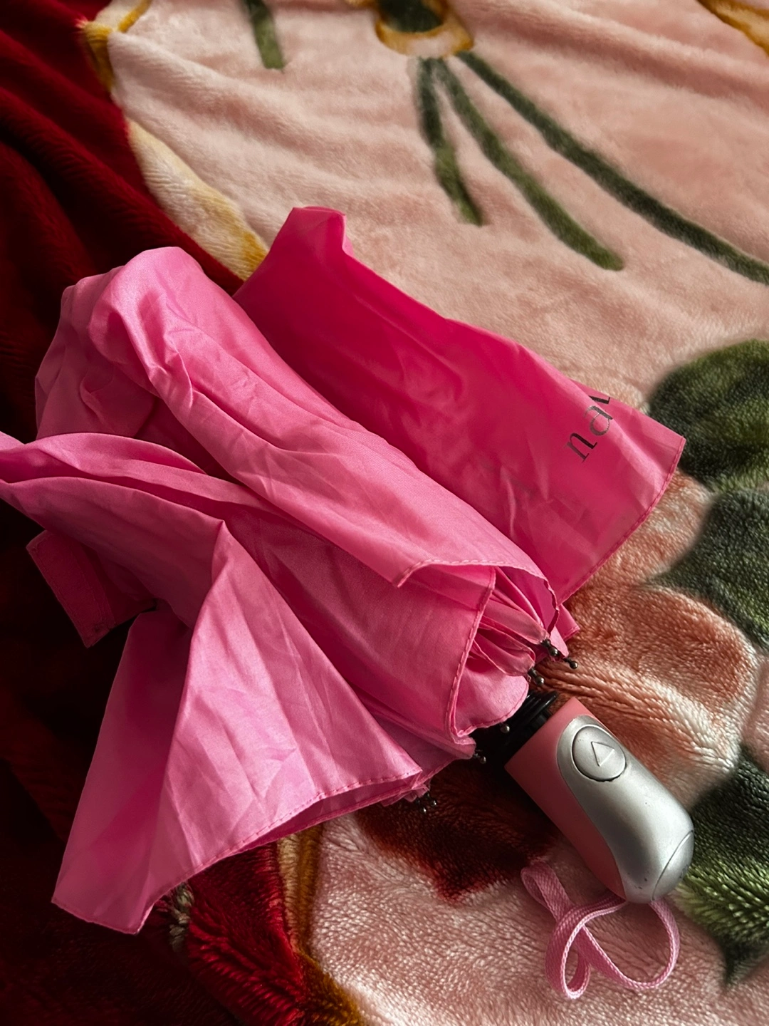Compact pink umbrella, folds down small for easy carrying. Silver handle with a button open and closure. Perfect for unexpected rain showers!