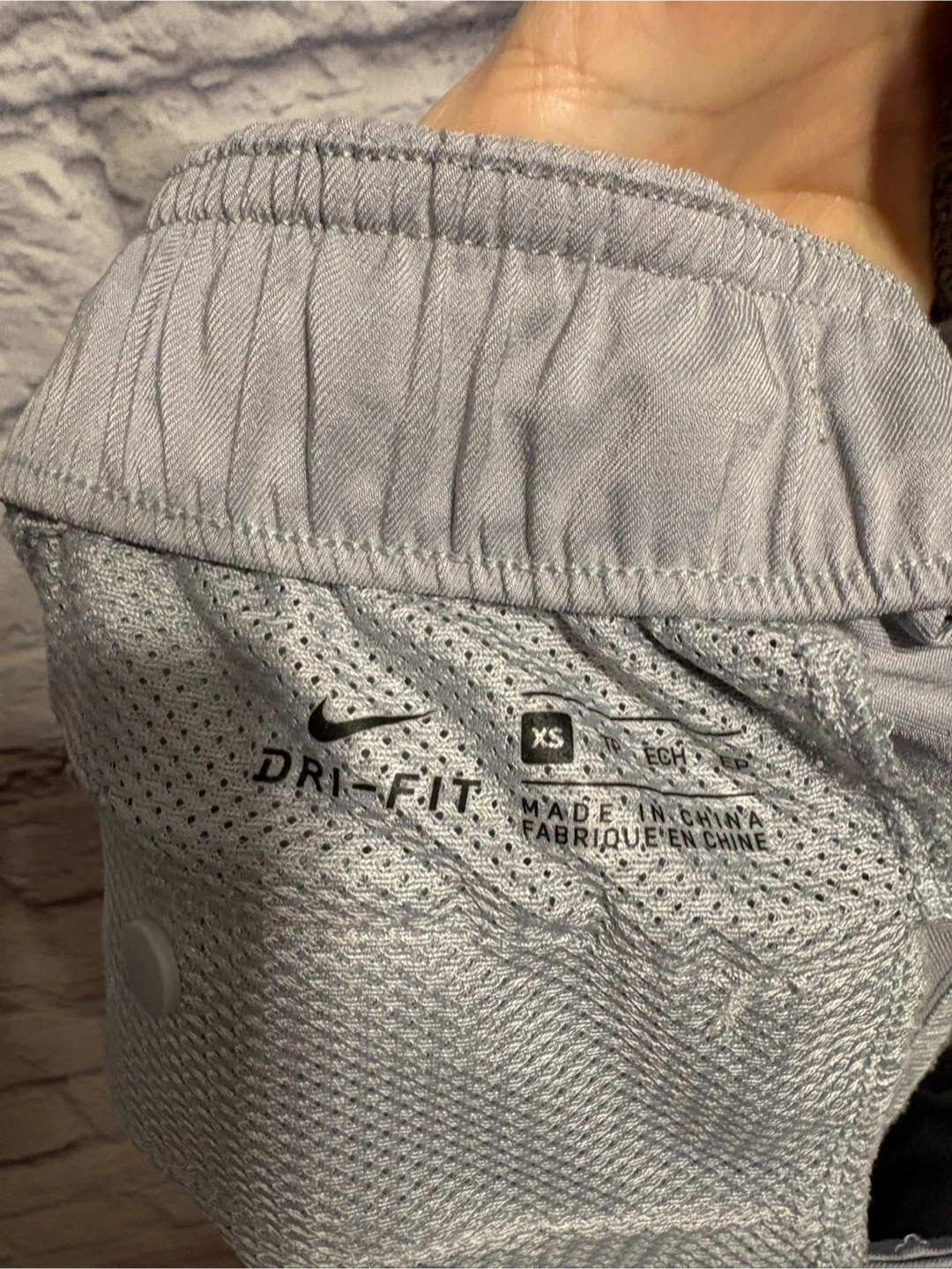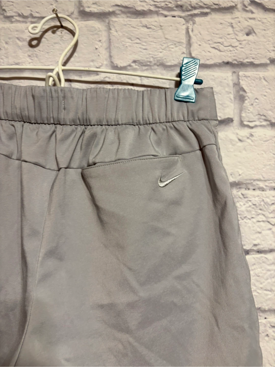 These Nike shorts are a light grey colour. They feature a pleated front and elastic waistband. The back has a small Nike swoosh logo. Gently worn. Pick up only.