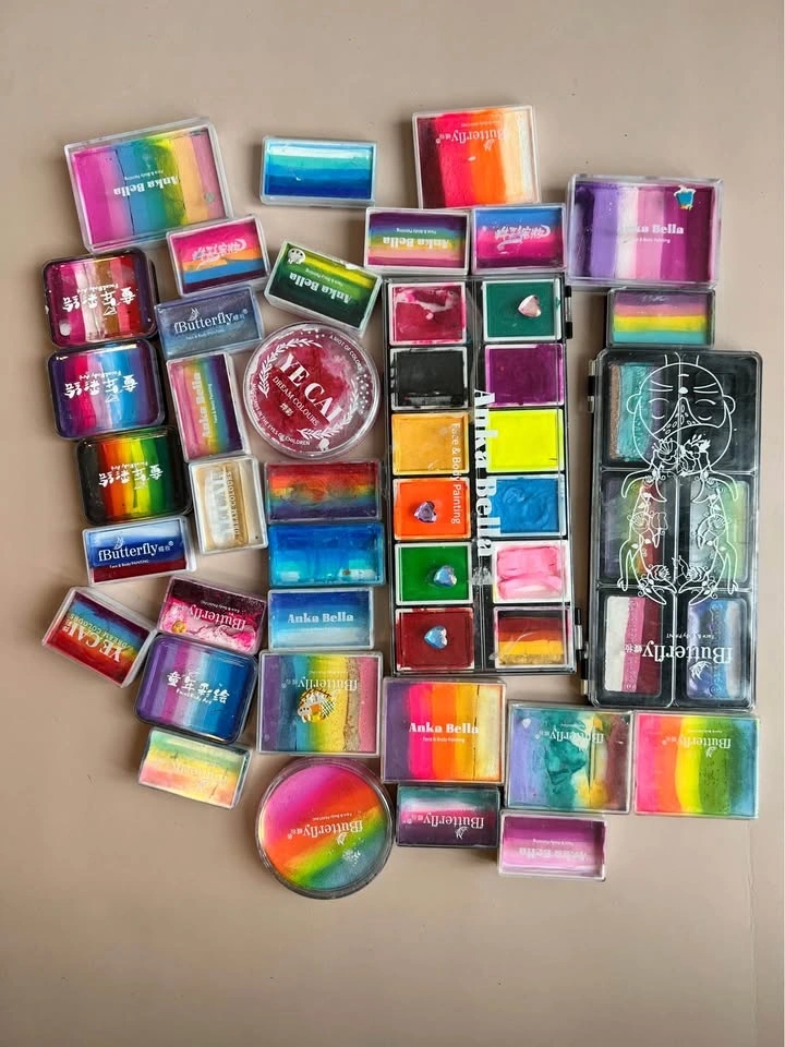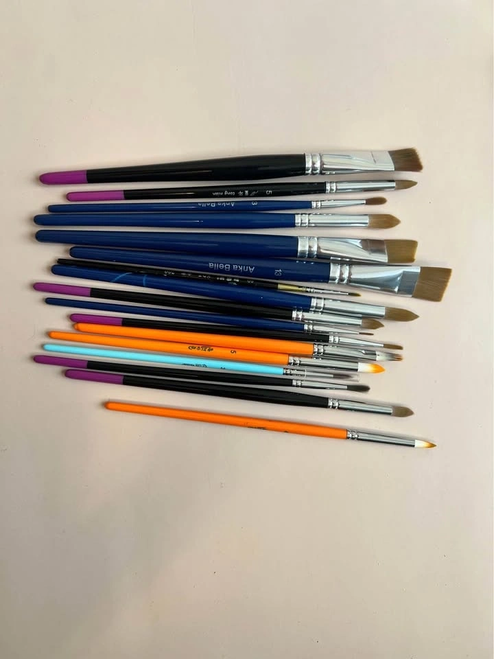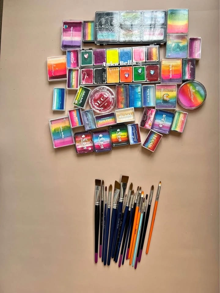 Colorful paint set with multiple rainbow and solid colors, plus a variety of brushes in different sizes. Gently used and still in good condition. Perfect for kids' art projects or parties!