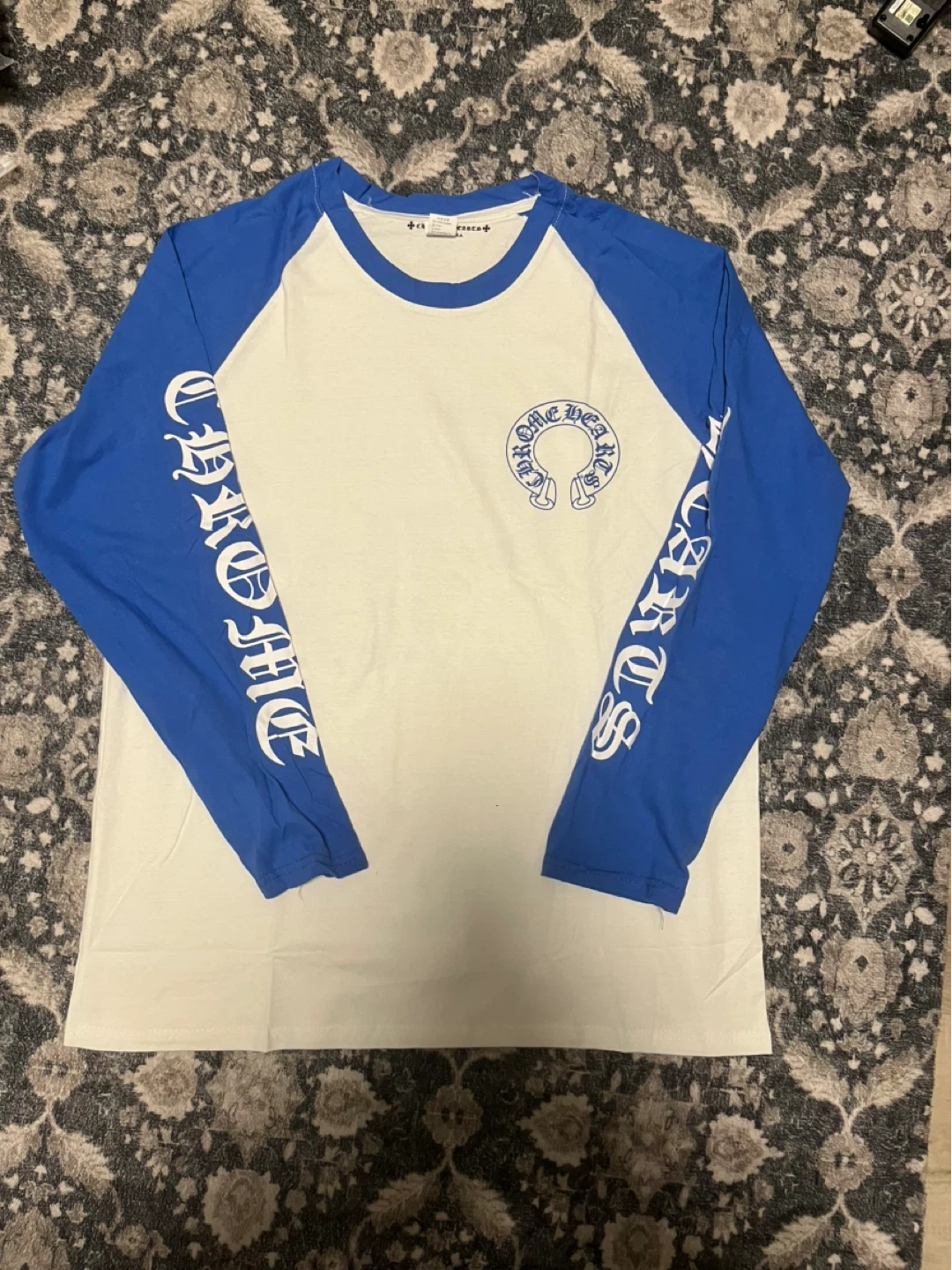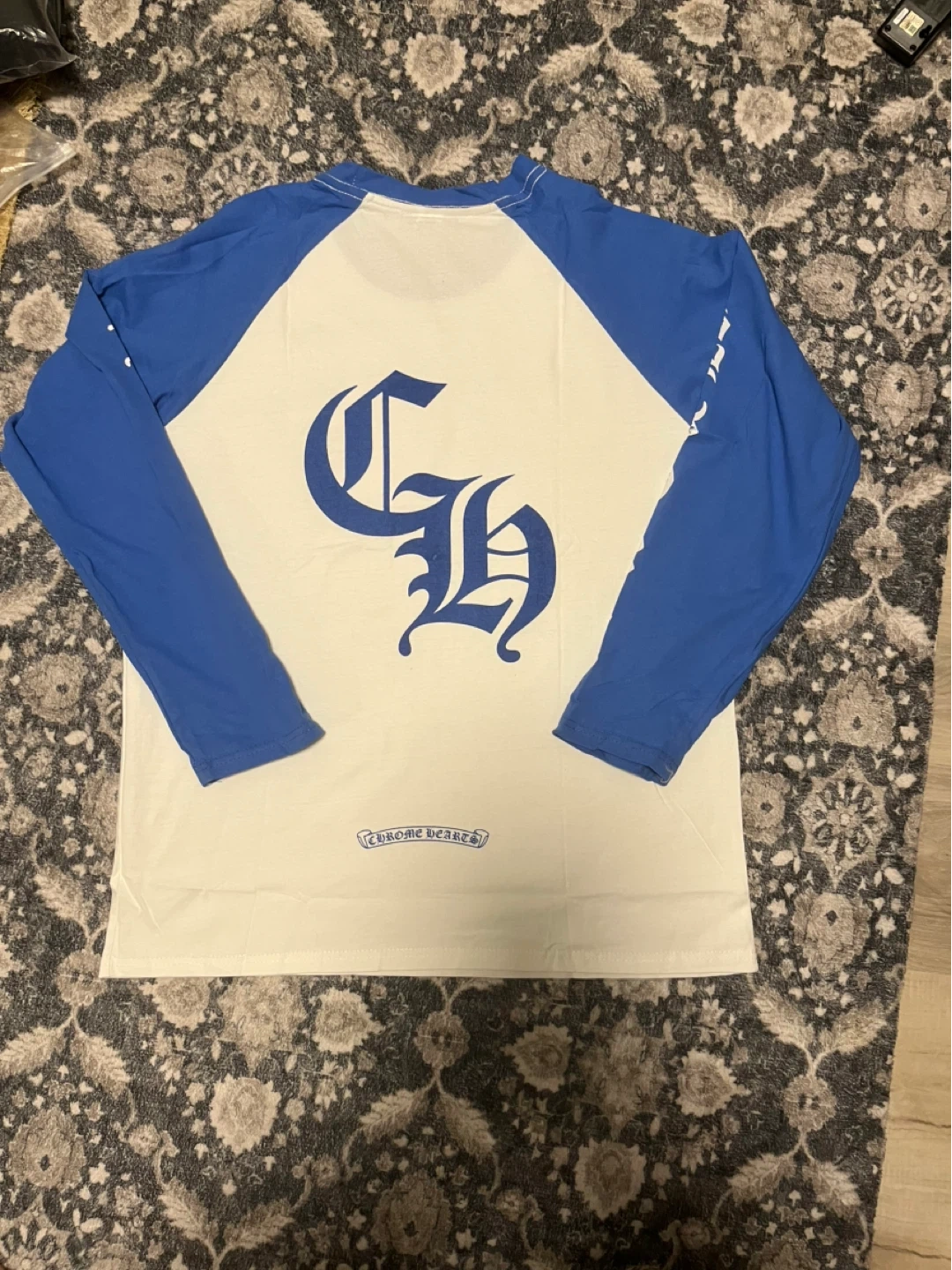 This is a Chrome Hearts long sleeve raglan t-shirt. It features blue sleeves and a white body. The front has a horseshoe logo, and the back has a large CH logo. Made for comfort and style!