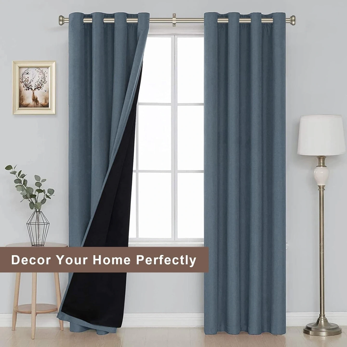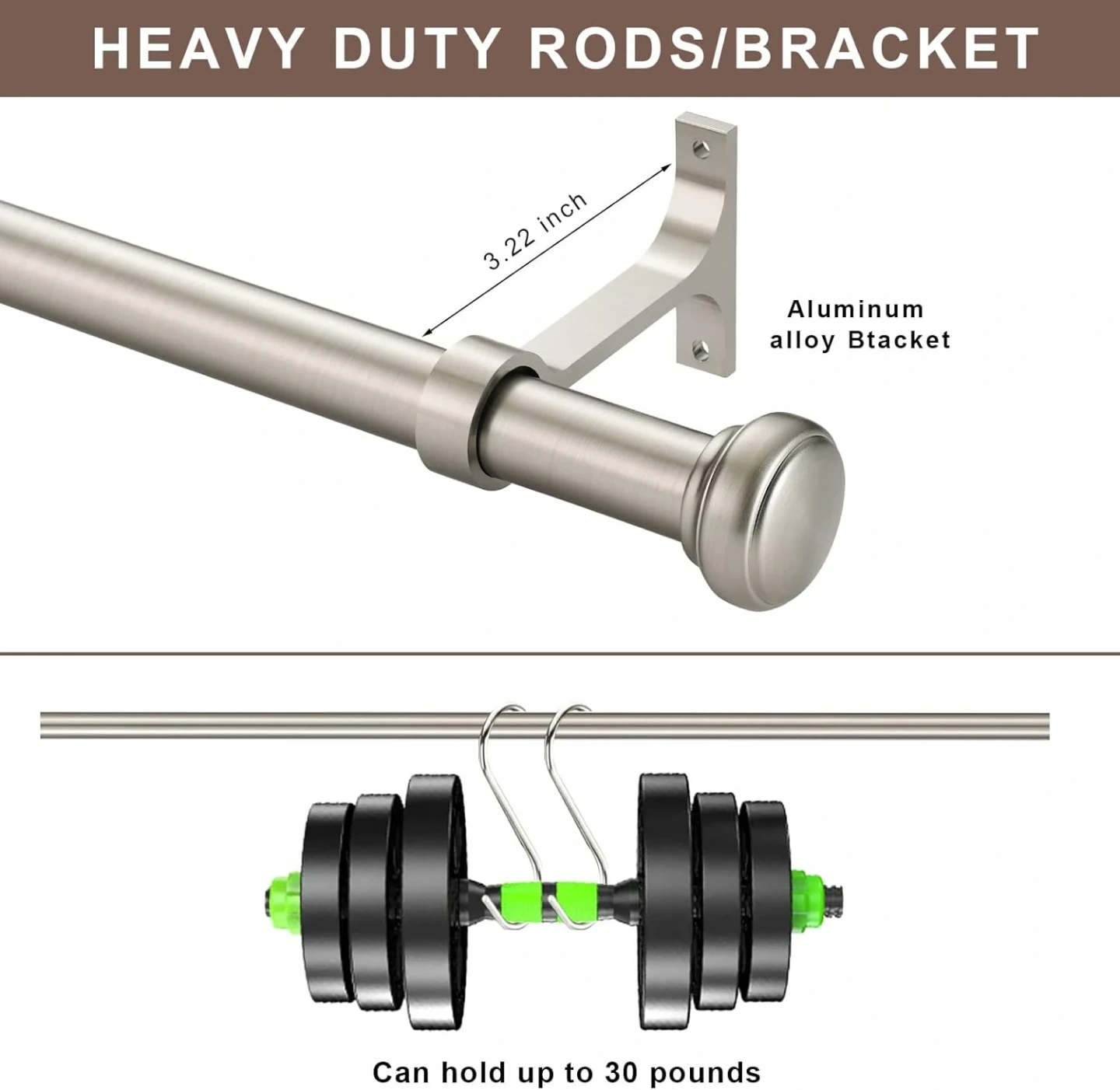 This heavy-duty curtain rod is made from aluminum alloy and can hold up to 30 pounds. It features smooth telescoping for adjustable length, classic end cap finials, and two installation options: wall mount or ceiling mount. Includes all necessary hardware like screws and anchors.