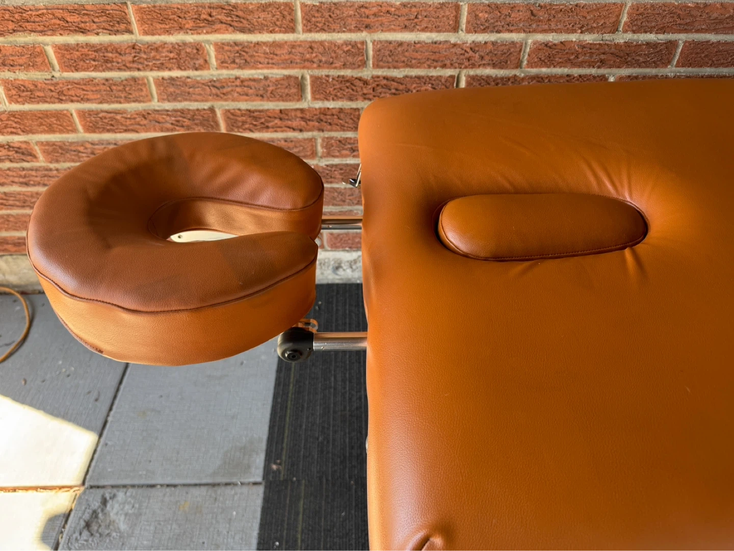 This is a Master brand portable massage table in a brown colour. It includes a removable face cradle and armrest. The table folds up for easy transport and storage.