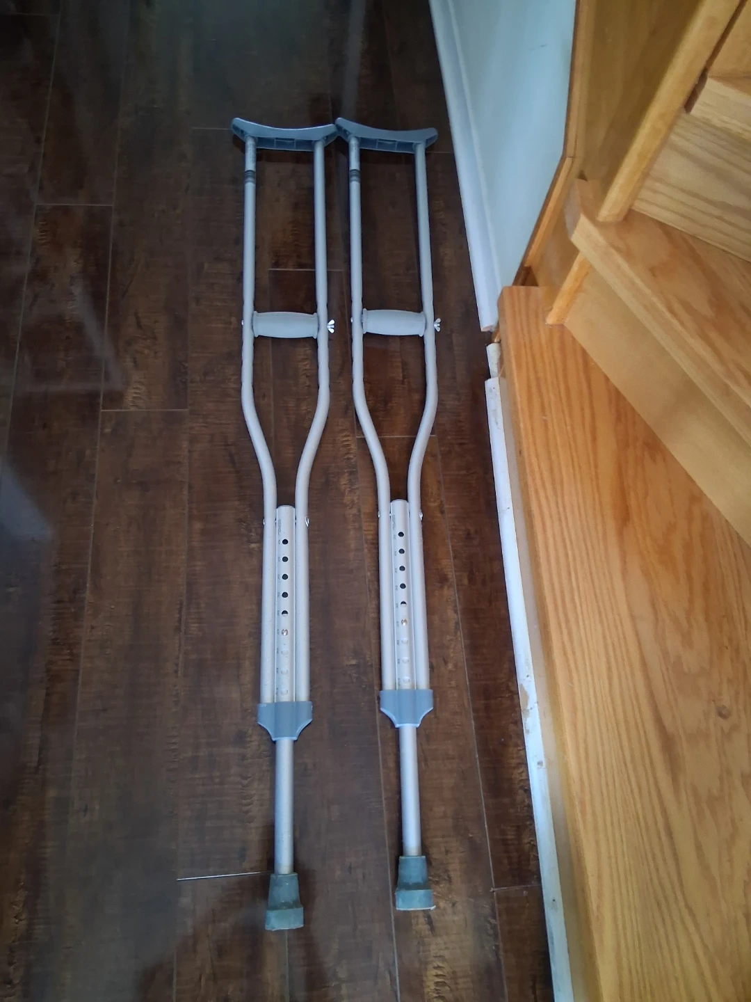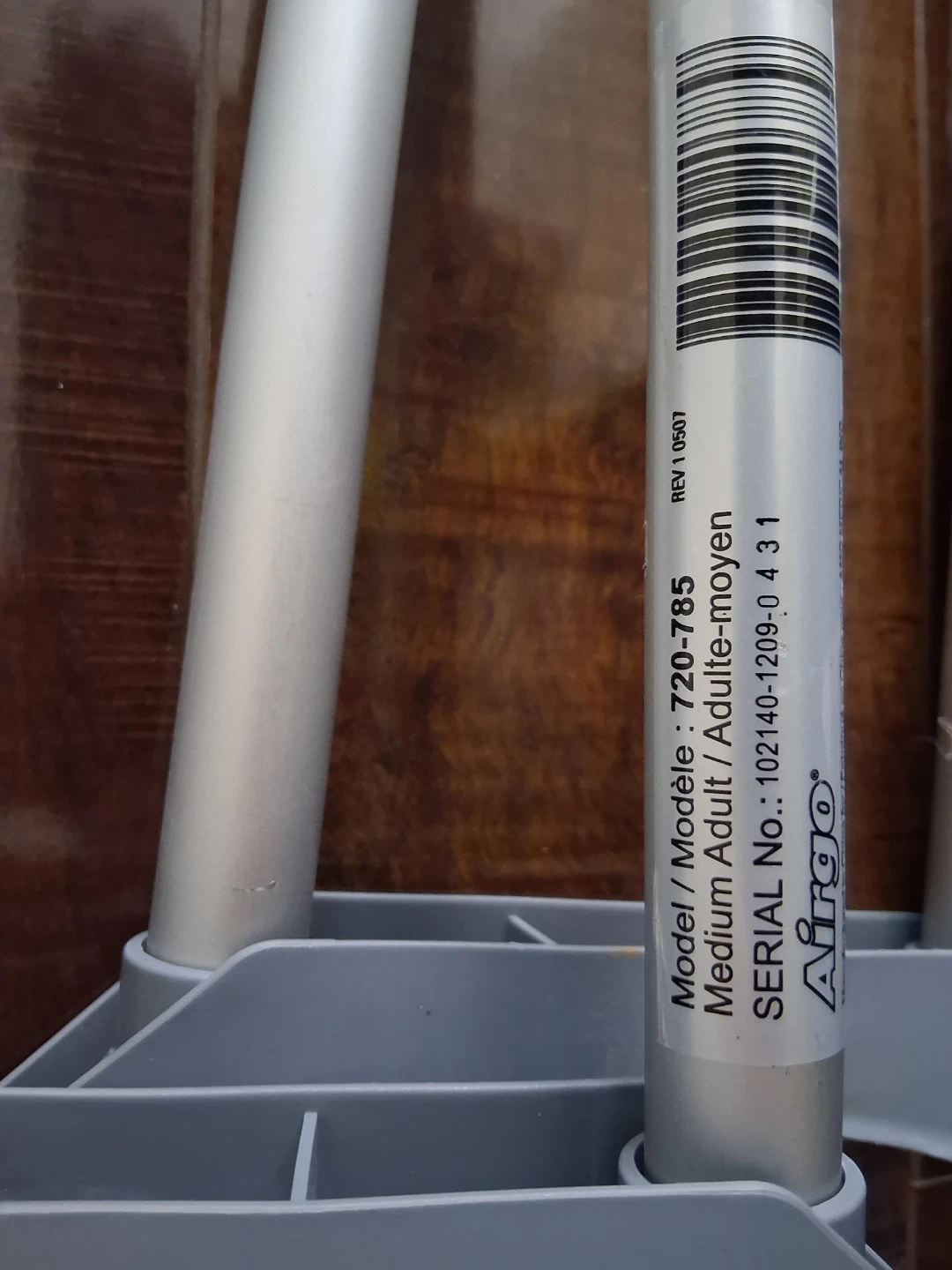 Argo adjustable adult crutches, model 720-785. Medium size. These crutches are made of aluminum. They're for adult use.