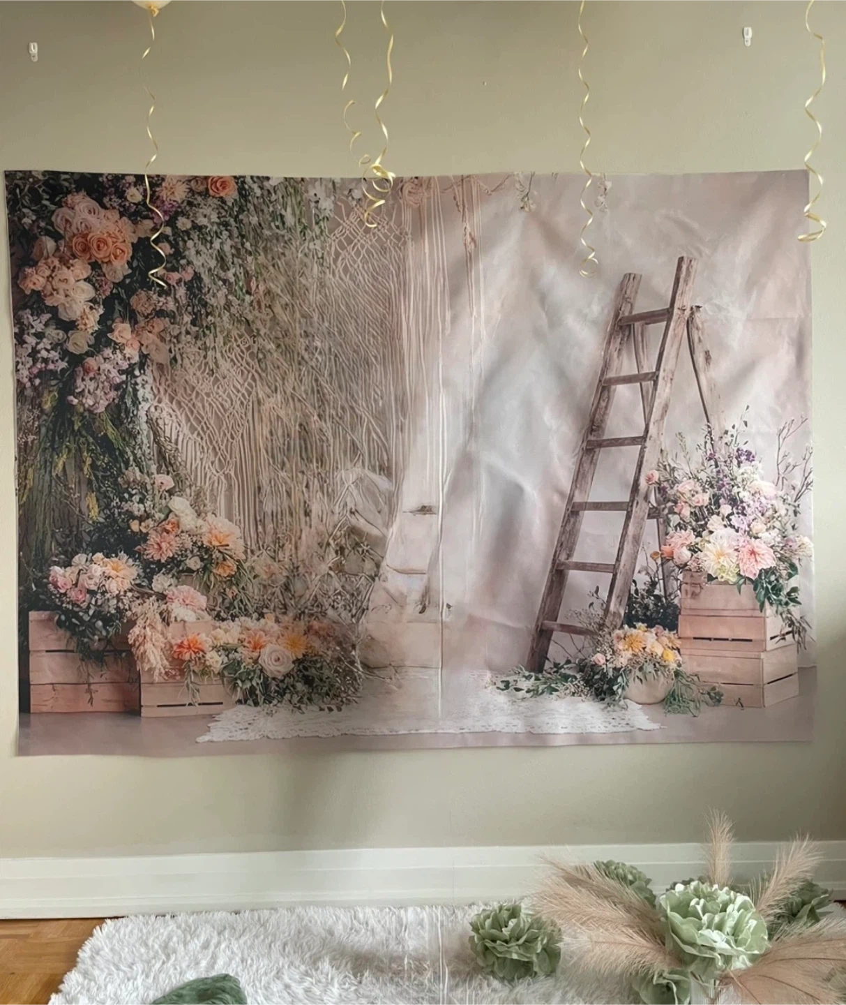 A Polyester Spring Garden Floral Background Banner. It's multicolor with dimensions of 210 by 150 cm. This backdrop is suitable for photography sessions.