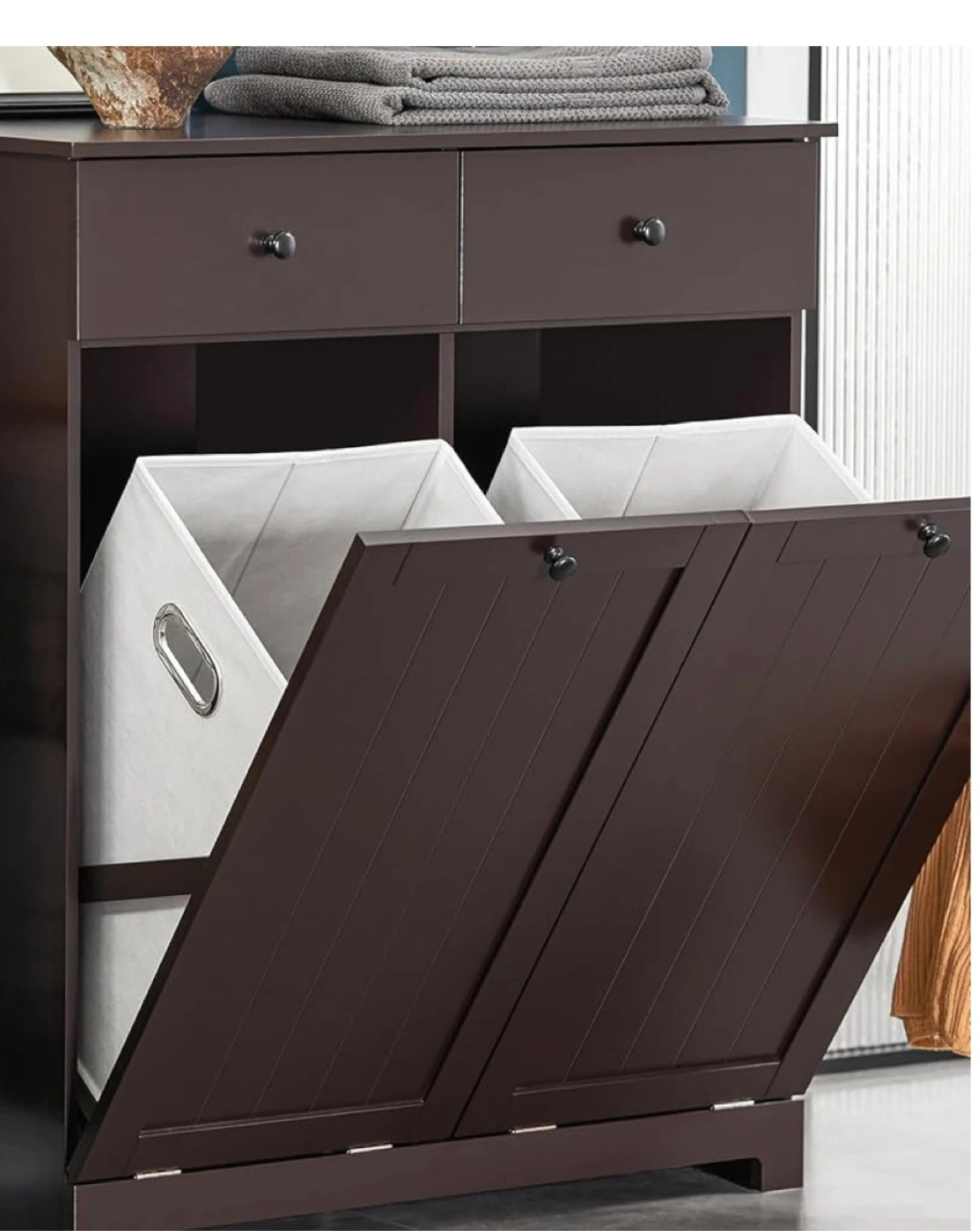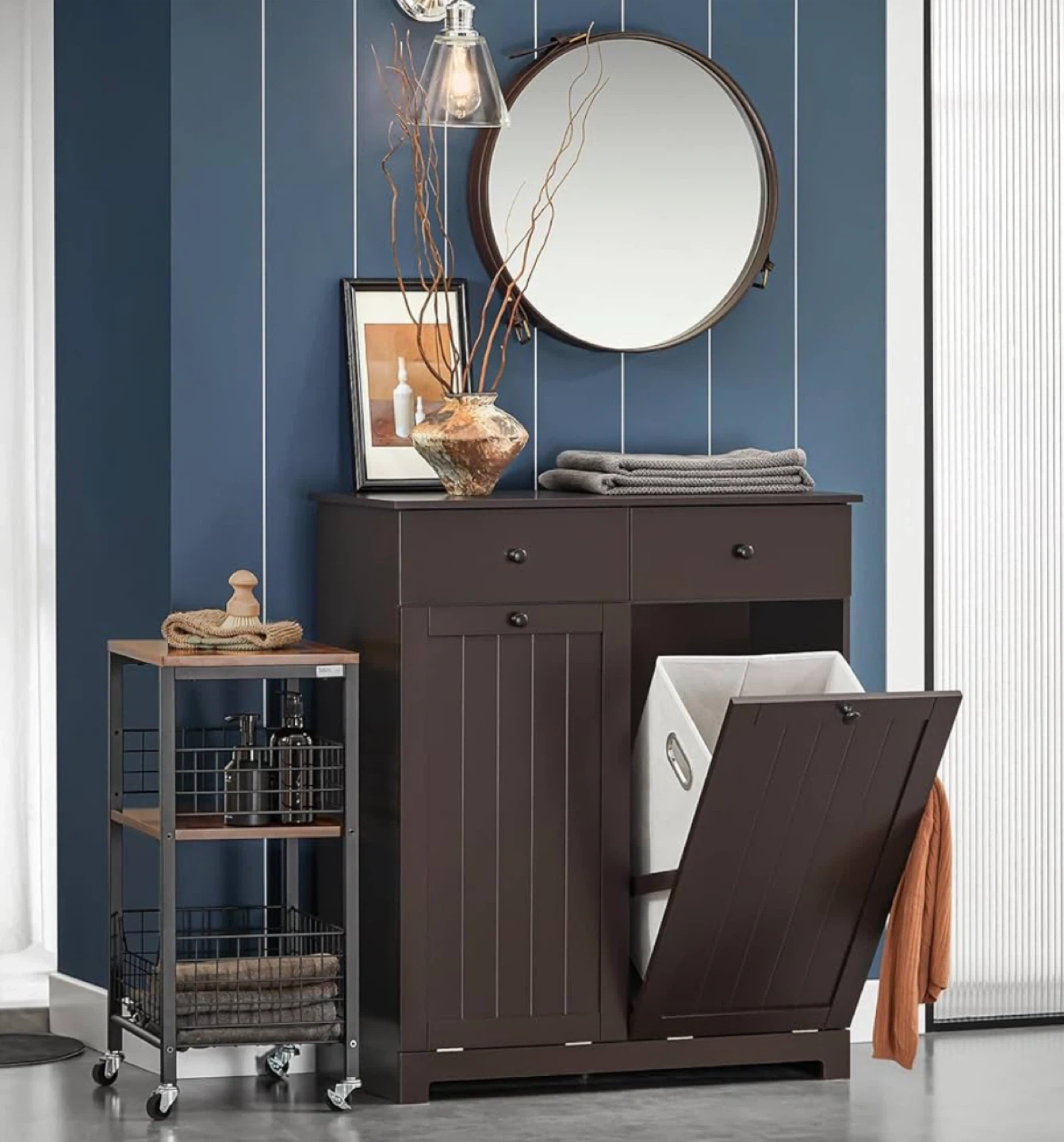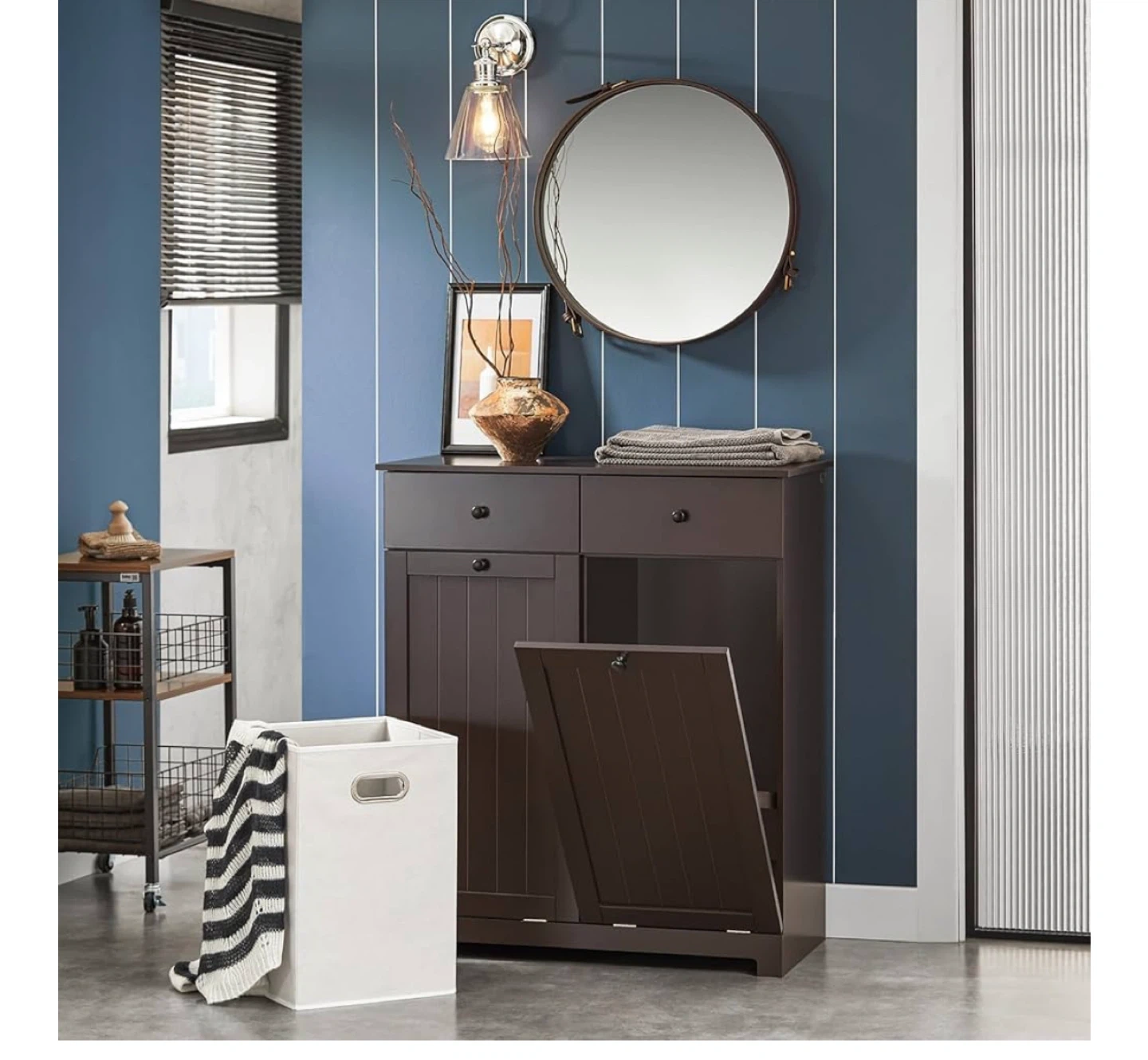 This is a nice brown bathroom cabinet with a built-in laundry hamper. It also has two drawers for extra storage. Great for keeping your bathroom tidy and organized