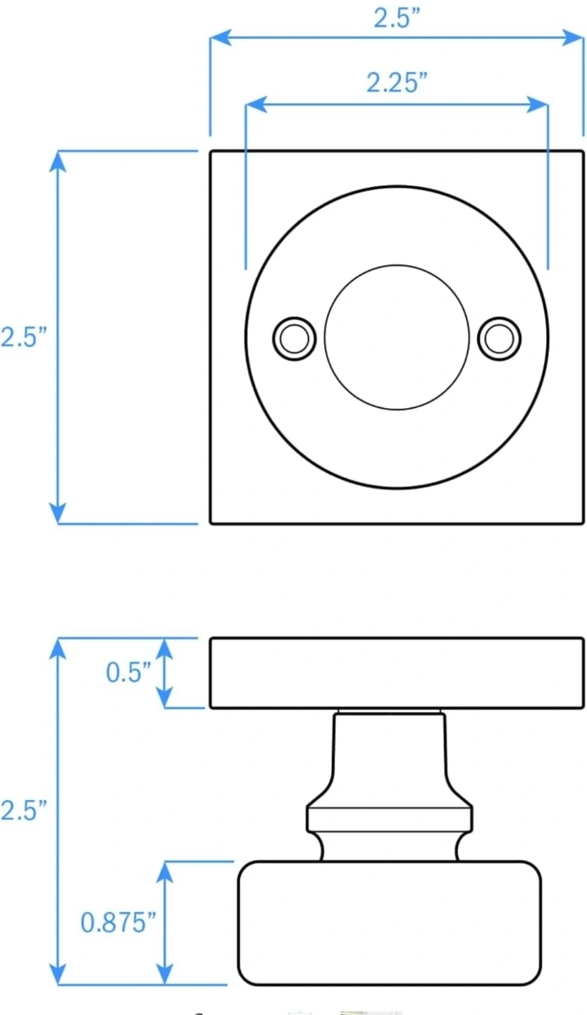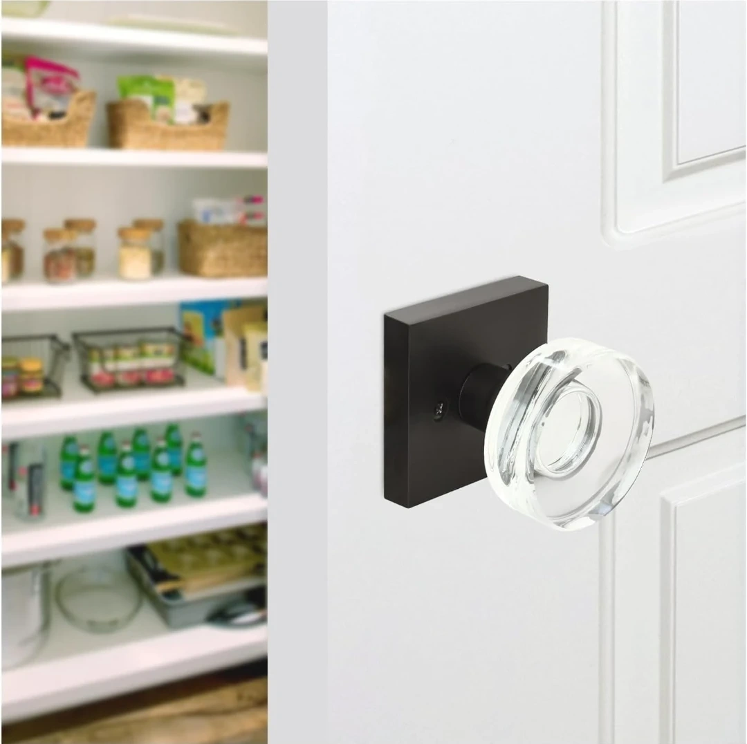 Set of two NUK3Y Nova crystal glass door knobs with matte black bases. Includes mounting screws. Measures 2.5" x 2.5" square base, knob is 2.5" height and 0.875" projection. These are dummy knobs, meaning they don't latch and are typically used for closets or as decorative pulls.