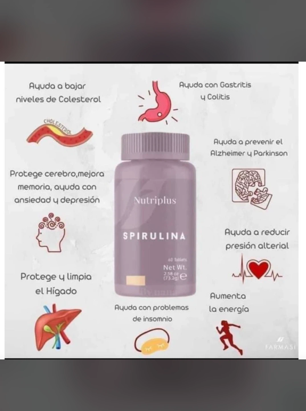 Nutriplus Spirulina comes in a bottle of 60 tablets with a net weight of 73.2g. It helps lower cholesterol levels, protects the brain, improves memory, aids with anxiety and depression, protects and cleanses the liver, helps with insomnia, increases energy, aids with gastritis and colitis, helps prevent Alzheimer's and Parkinson's, and helps reduce arterial pressure.