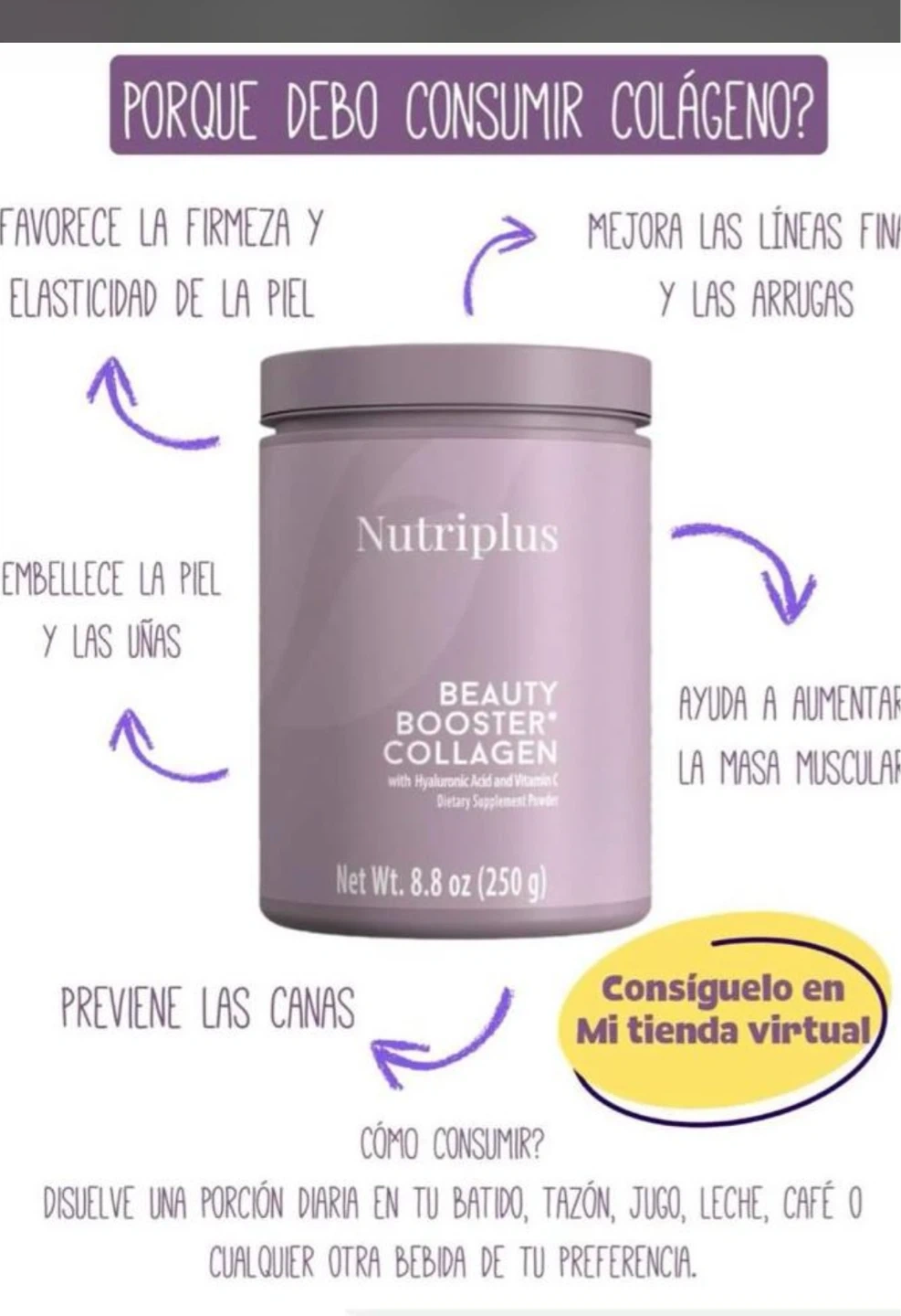 Nutriplus Beauty Booster Collagen contains Hyaluronic Acid and Vitamin C. It enhances skin and nail beauty, improves skin firmness and elasticity, reduces fine lines and wrinkles, helps increase muscle mass, and prevents gray hair.