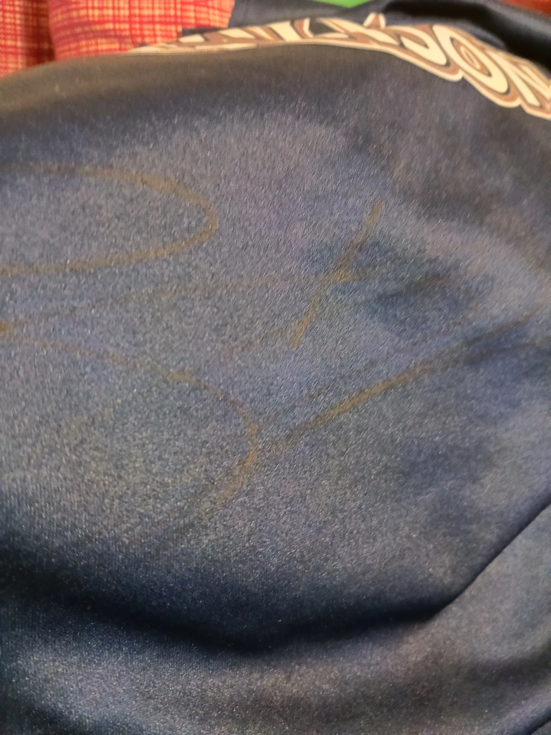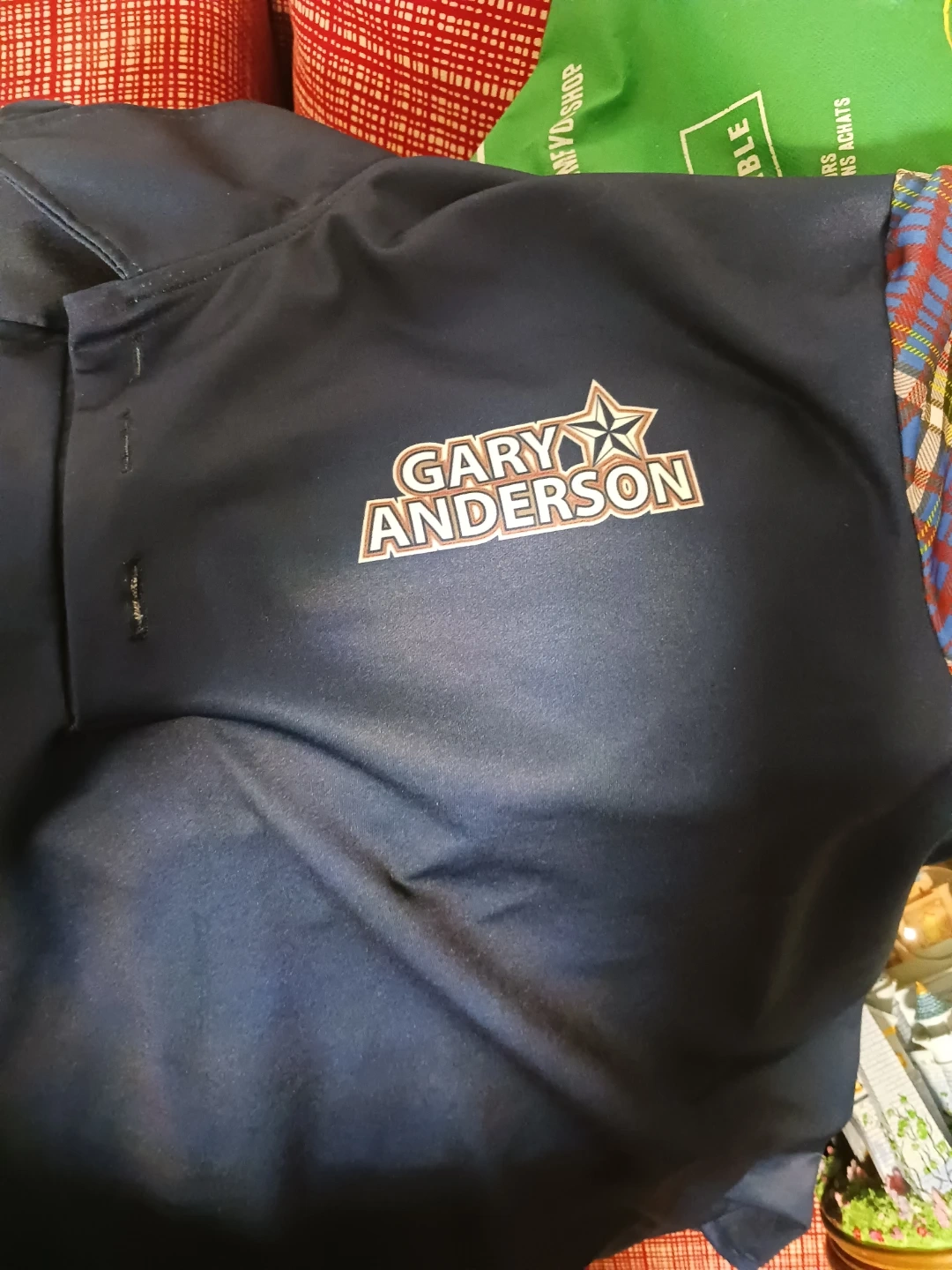 Here's a navy blue polo shirt featuring the Gary Anderson logo. It has some signs of wear, as shown in the pictures. Signed and warn by him on the 2016 world championship game