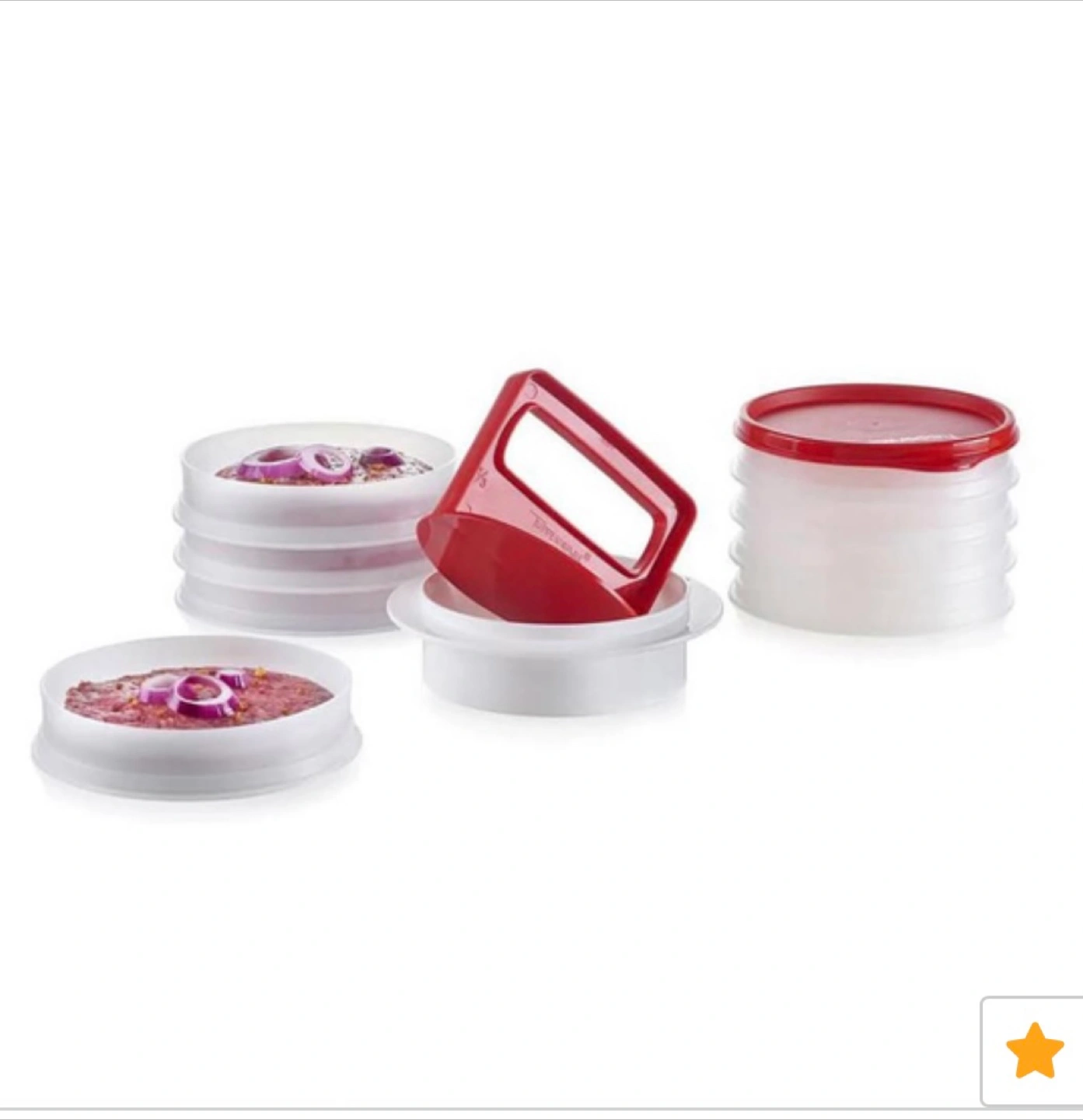 A Tupperware hamburger press and keeper set. Includes press with ring and four freezer-safe keepers and one seal. A great way to easily make and store hamburgers.