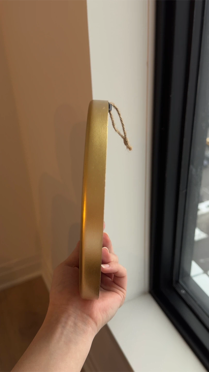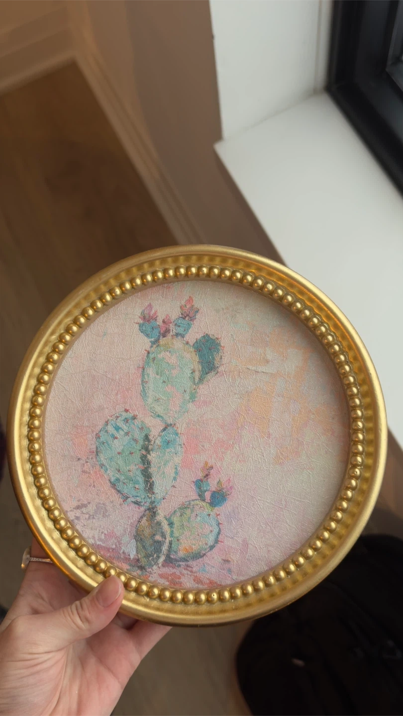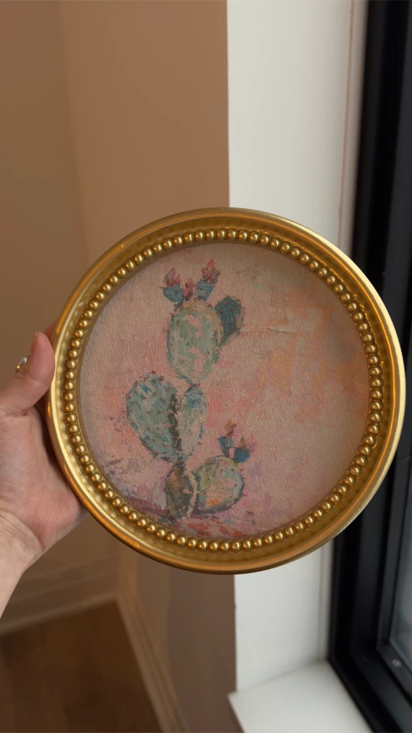 This is a lovely round framed piece of art featuring a prickly pear cactus. The frame is a decorative gold colour. It's ready to hang with a jute string. It's a nice decorative accent for any room!