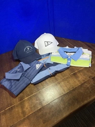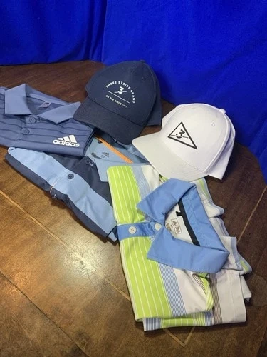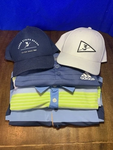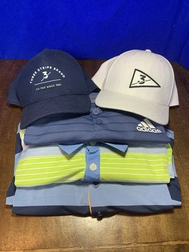 Great bundle for any golfer or golf apparel collector. This lot includes 5 total items: 3 Adidas Golf Polo Shirts (Men's Medium) and 2 Three Stripe Brand Golf Hats (Adjustable, One Size Fits Most). These are stylish golf polos in modern colorways, perfect for golf outings, casual wear, country club attire, or for golf fans and collectors. The hats feature the Three Stripe Brand golf logo and adjustable snapback closures. All items are pre-owned and in good condition with normal wear from light use. Please review all photos carefully as they are part of the description. Feel free to message with any questions. Thank you for looking!