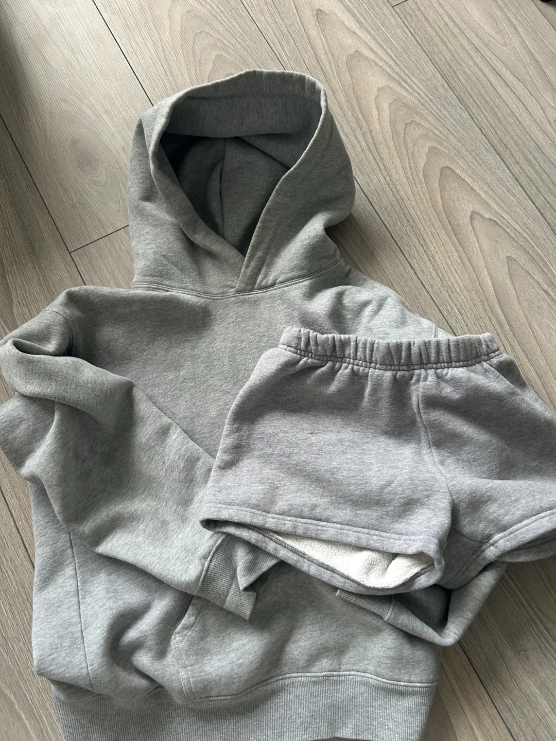 Comfy grey hoodie and matching shorts set. It's made from a soft cotton blend. This set is great for lounging or casual wear. Size small hoodie and XXS shorts, but the fit is a bit bigger.
