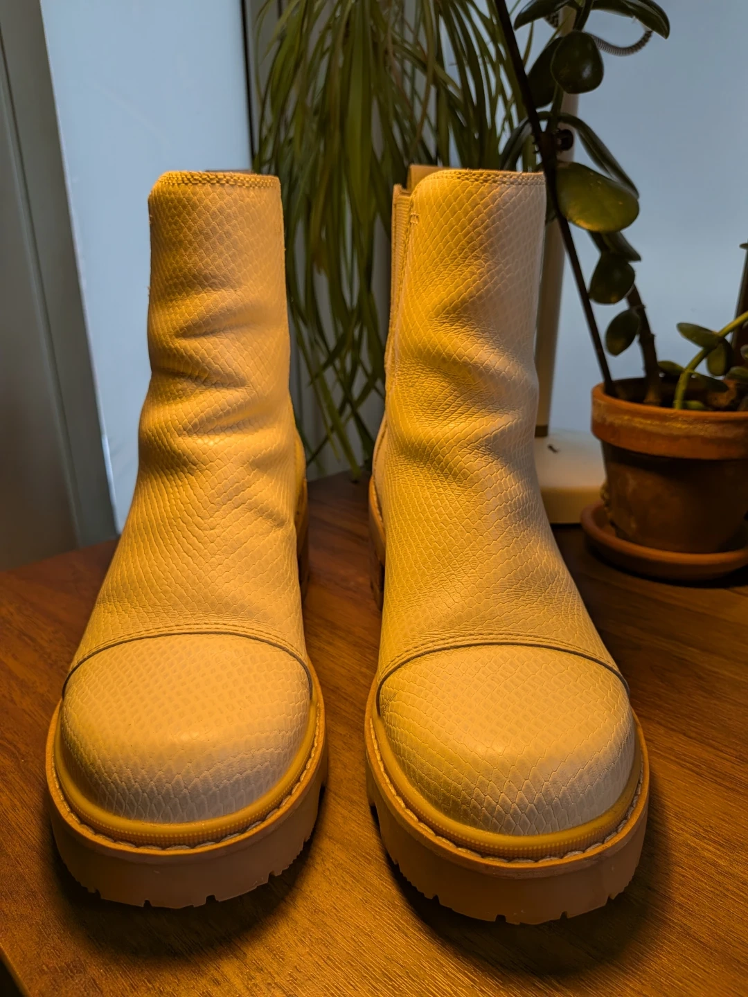 Cream coloured Sorel ankle boots with a snake-embossed pattern. These boots feature elastic side panels and a sturdy lug sole. They're comfortable for everyday wear.