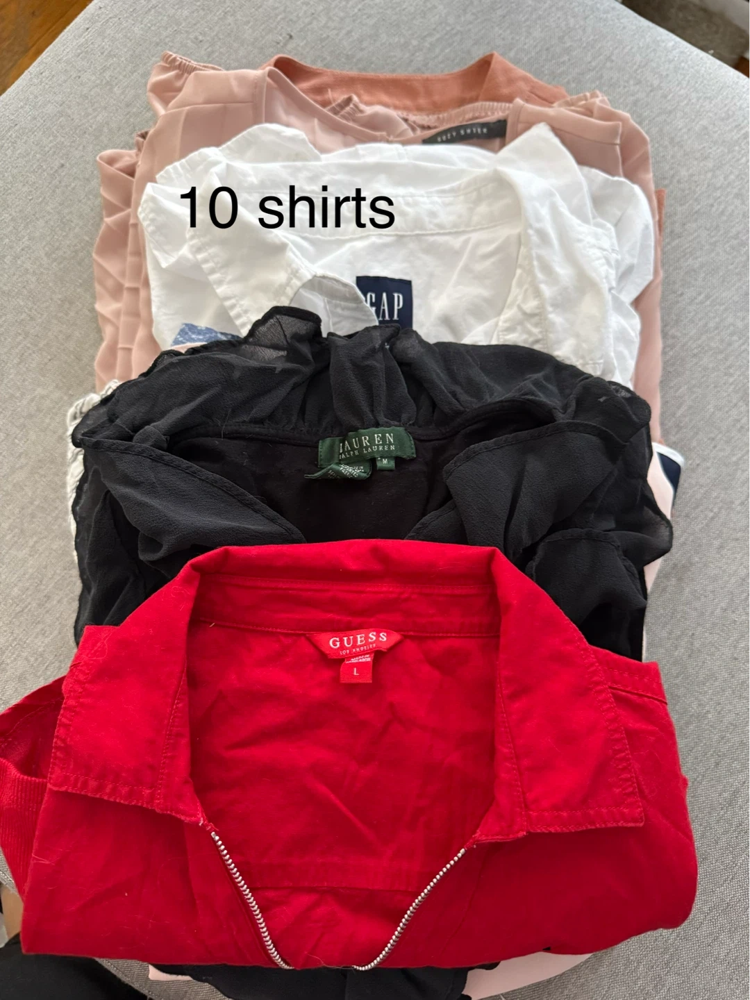 This is a bundle of gently used women's clothes. Some only worn once. Includes brands like Guess, Ralph Lauren, Gap and others. Different colours and styles are included in this lot. S