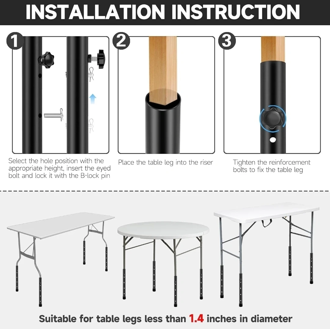 These table leg extenders are designed to raise your folding table to standing height. They feature eye bolts with B-lock pins for four levels of height adjustment and non-slip rubber leg covers. Made from heated cold-rolled steel, electroplated to prevent corrosion and rusting. They enhance stability and reduce shaking.