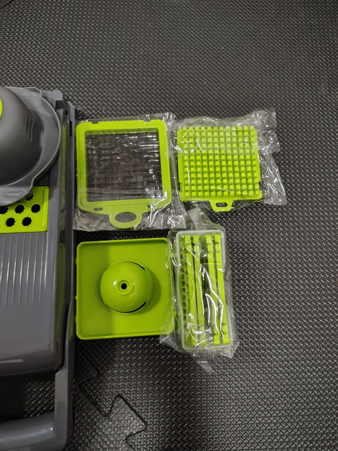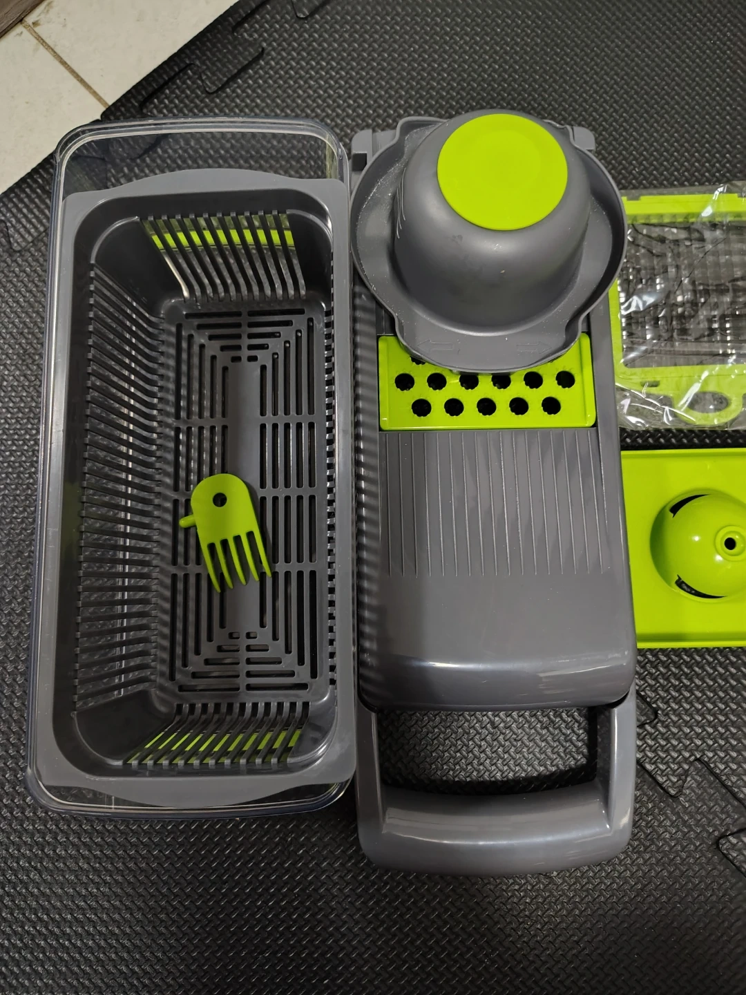Looking to make meal prep easier? This vegetable chopper is perfect for quickly dicing and slicing veggies! It comes with multiple interchangeable blades and a container to catch everything. The colours are grey and green. It's new, never used it before