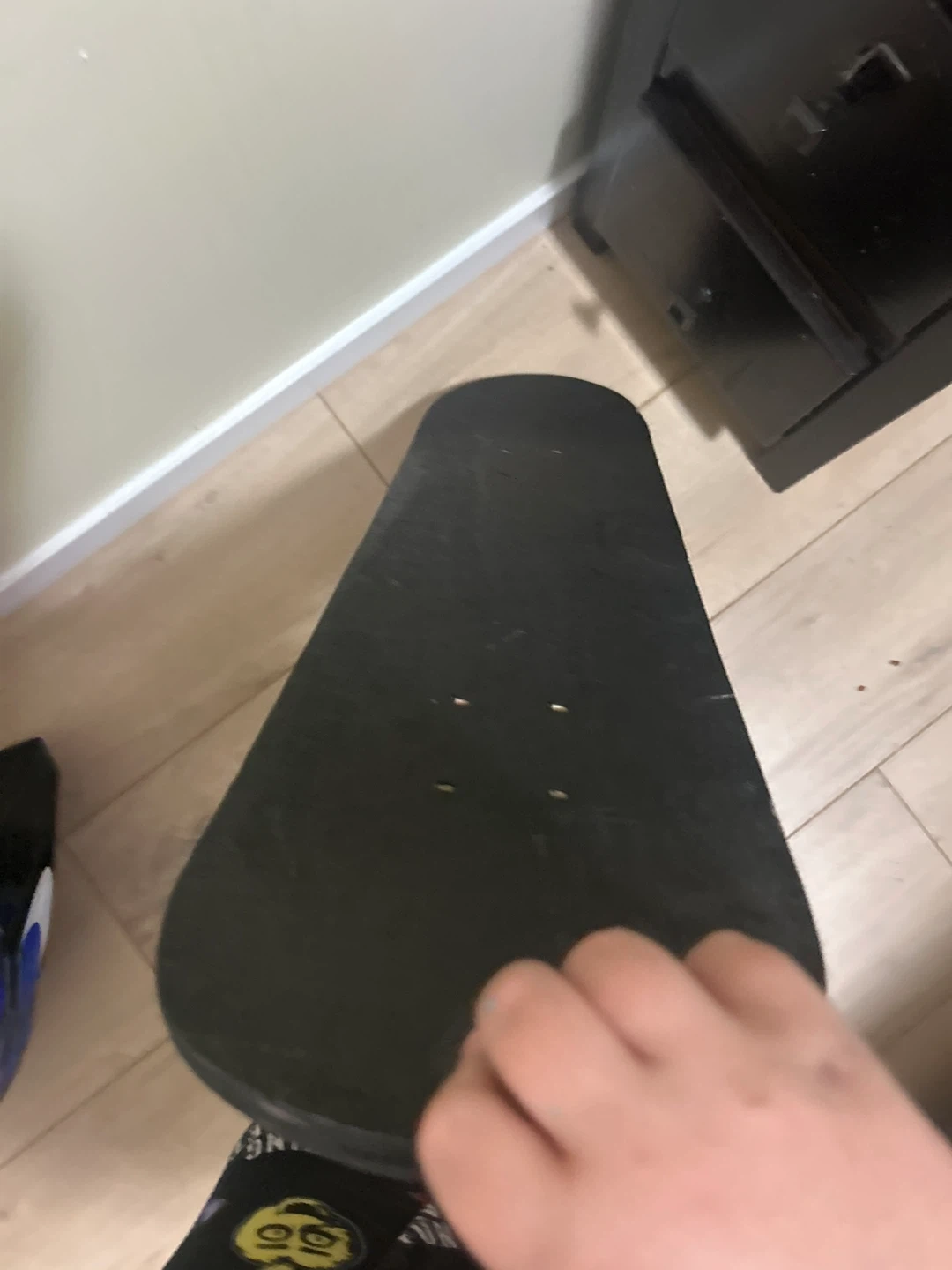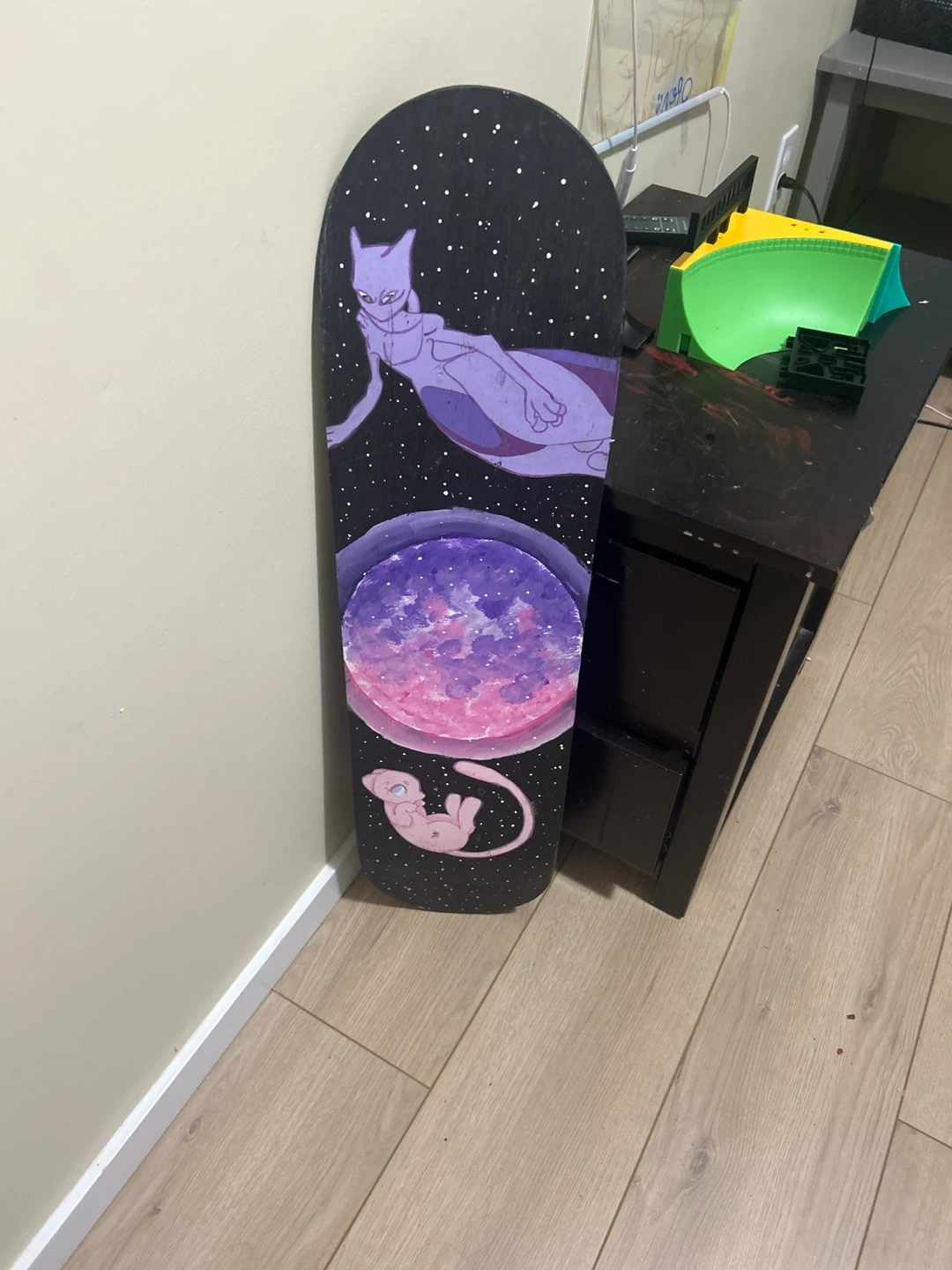 Custom painted skateboard deck featuring Mewtwo and Mew in a starry space theme. It's a standard skateboard deck with a black grip tape underside. This deck would be a cool addition for any Pokemon fan!