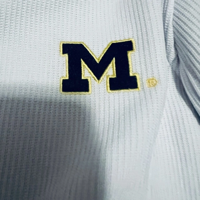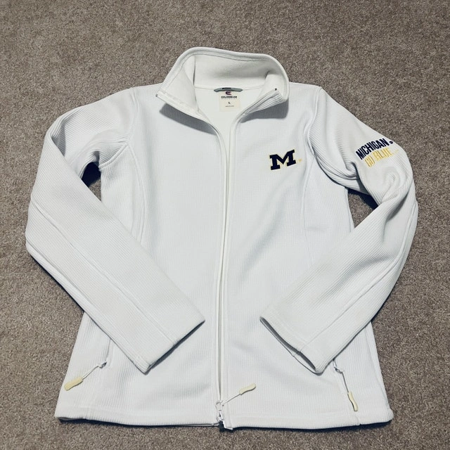Show your team spirit with this Colosseum Athletics Michigan Go Blue white jacket, size large. This jacket is in good condition, perfect for showing off your Michigan pride, whether you're heading to the game or just out and about! It features the iconic 'M' logo and 'Michigan Go Blue' on the sleeve. Here are some of its features: * Full zip front * Embroidered logos * Ribbed texture * Front pockets. Let me know if you're interested!