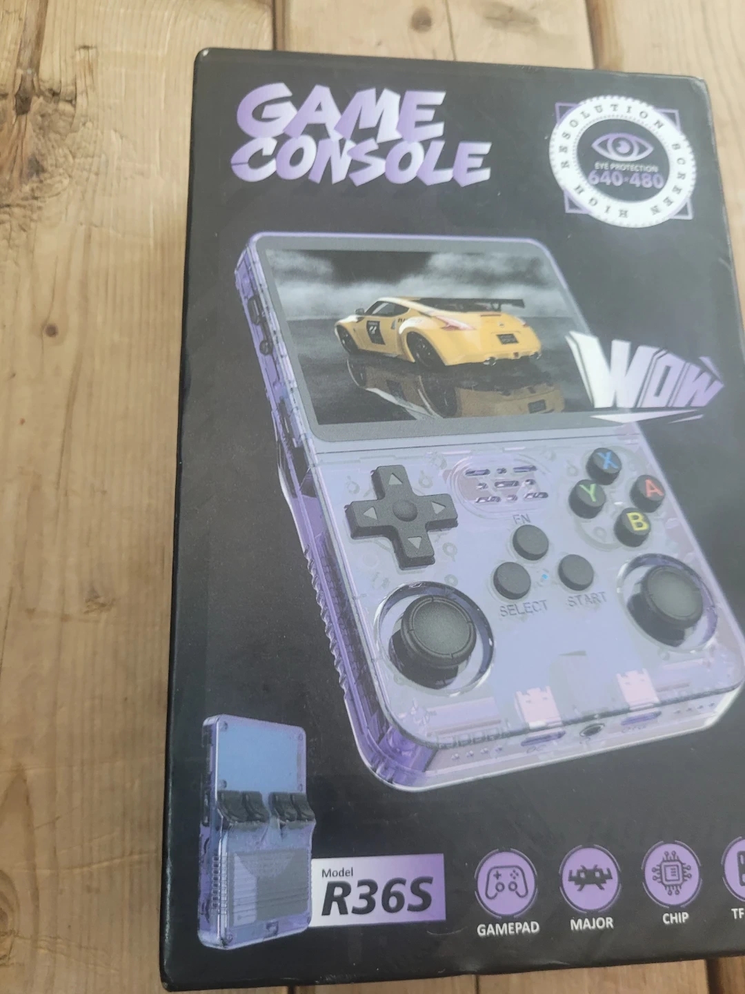 This is a R36S retro handheld game console. It features a transparent purple casing and a 640x480 resolution screen. It's designed with a gamepad, major components, and a chip for gaming.15k games