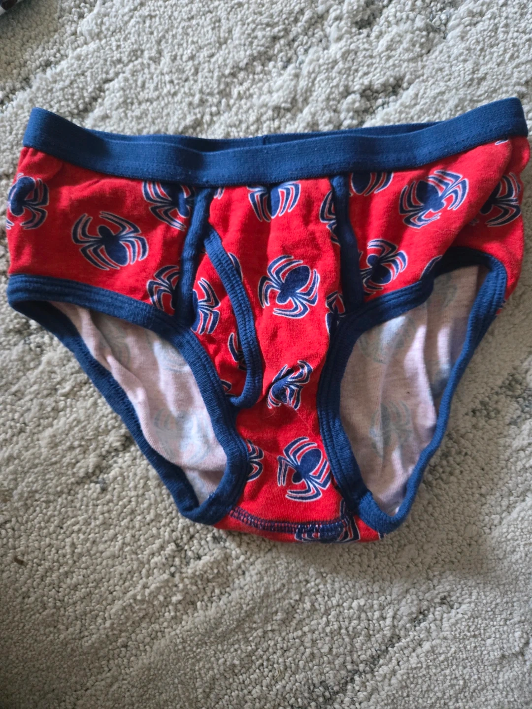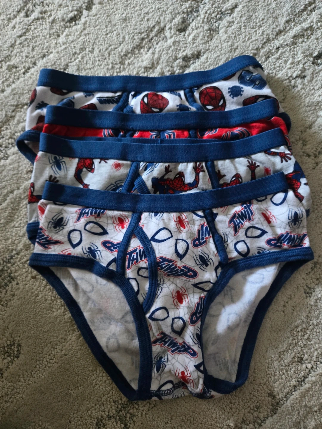 Four brand new pairs of kids Spider-Man underwear featuring Spidey designs and blue trim and cotton material for comfort.