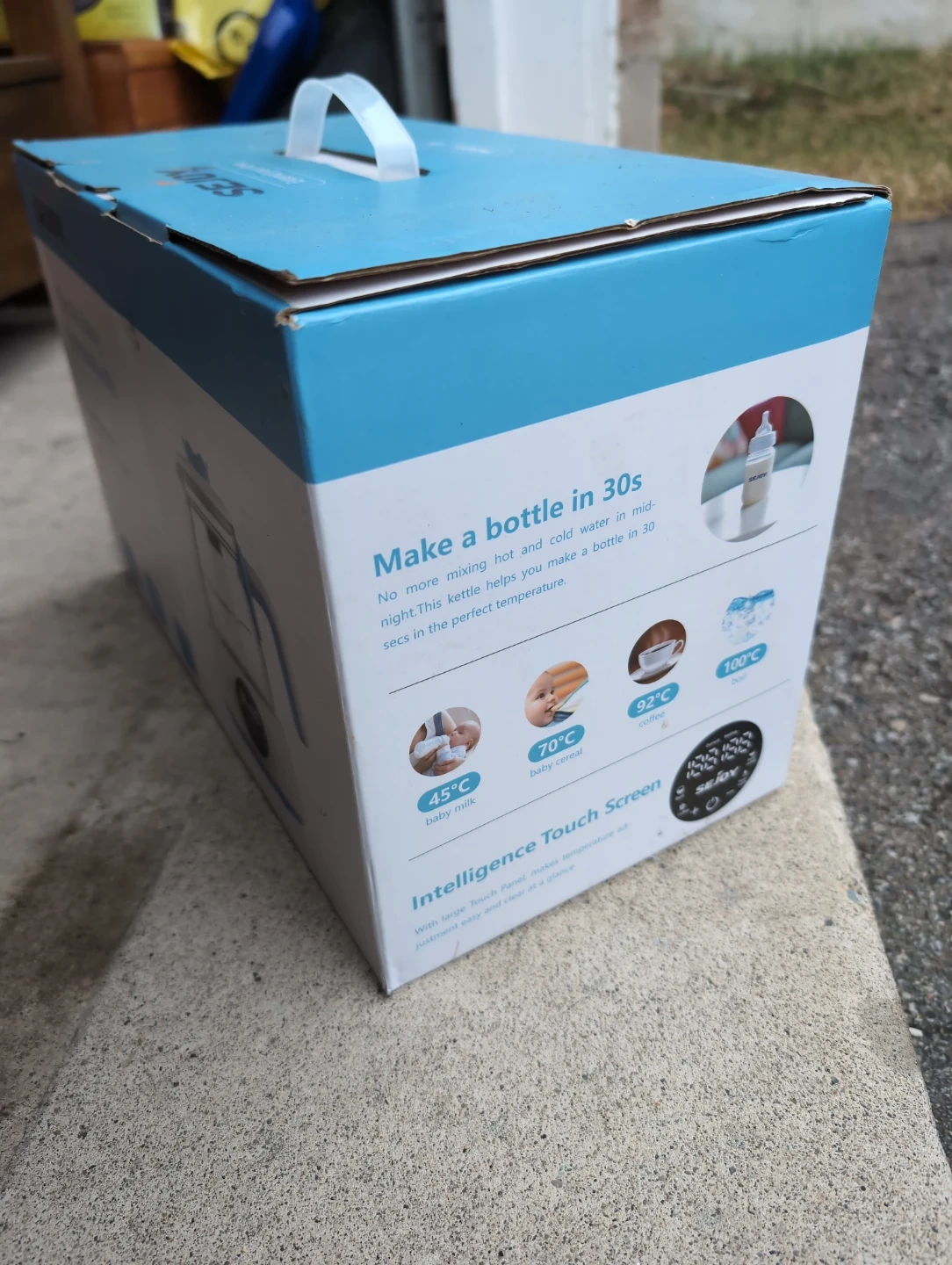 This SEJOY electric baby formula kettle helps make a baby bottle in 30 seconds. It has precise temperature control and an intelligence touch screen. Different temperatures for baby milk, baby cereal, and coffee are indicated.