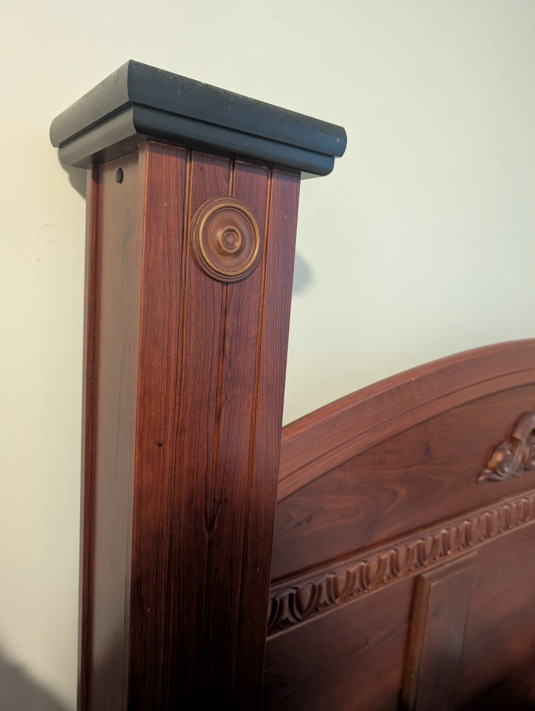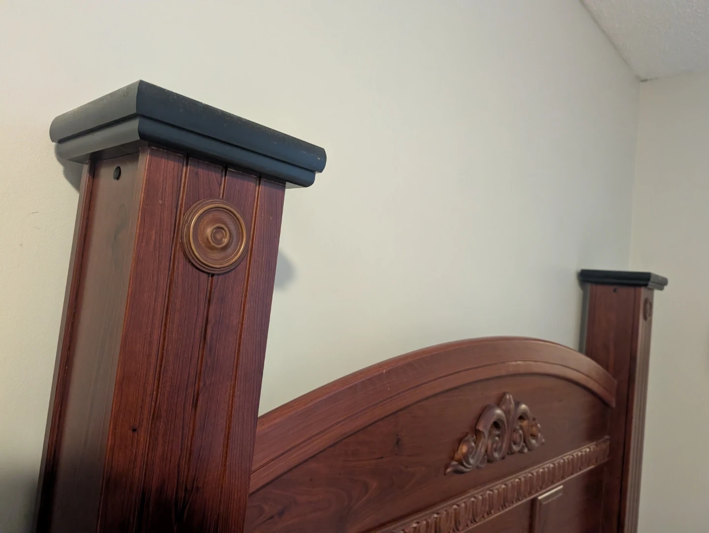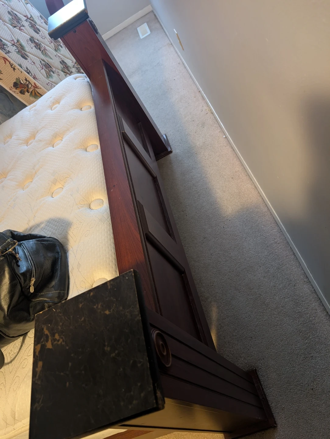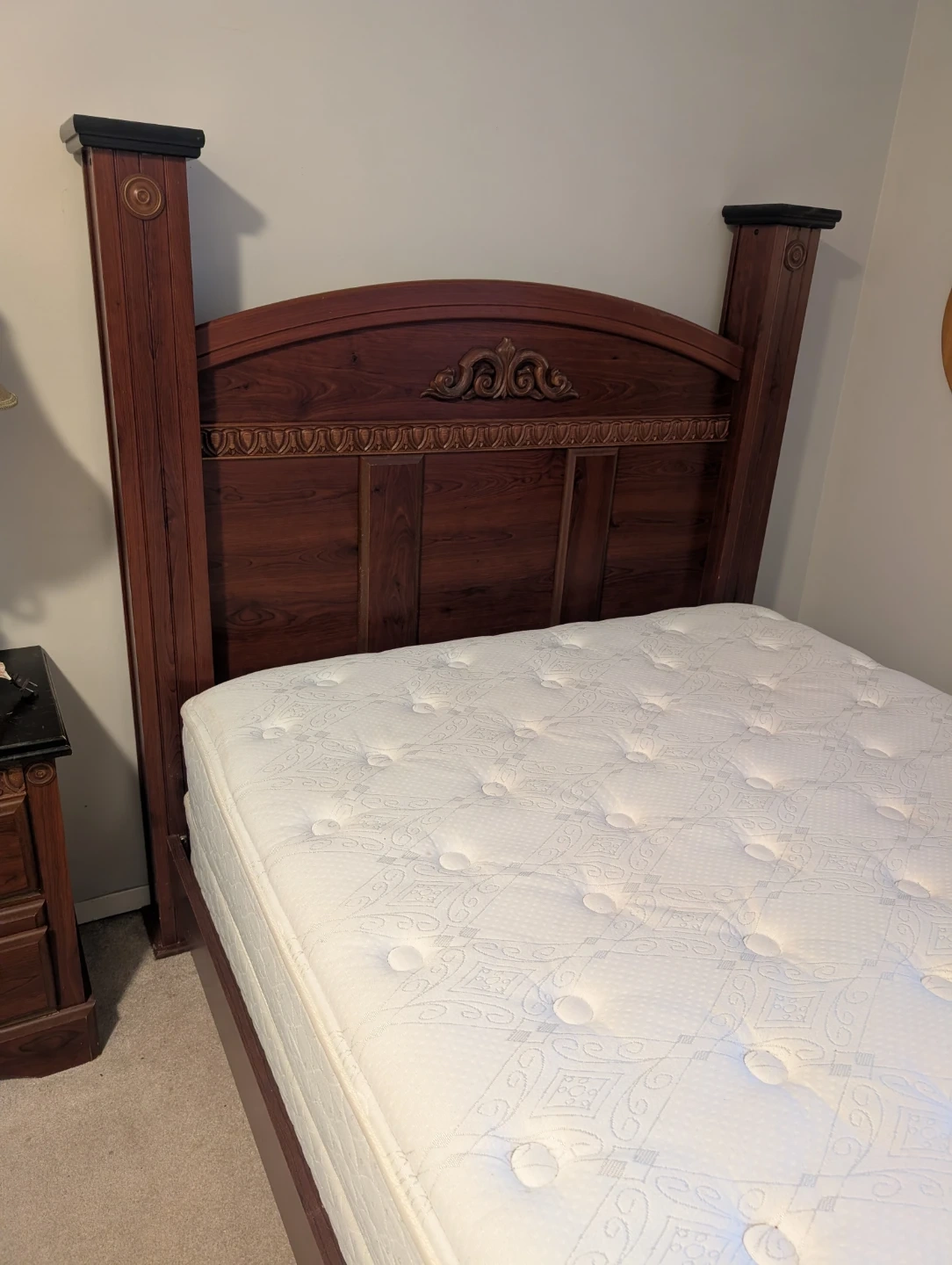 This is a sturdy wooden bed frame, dark wood finish. It includes a headboard with decorative carving and footboard ando matching nightstand. Mattress included. Bought at the Brick for over $1500.