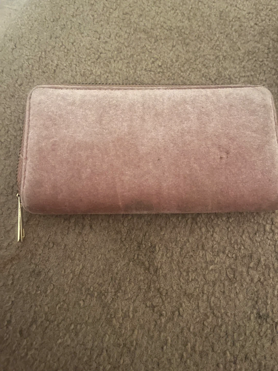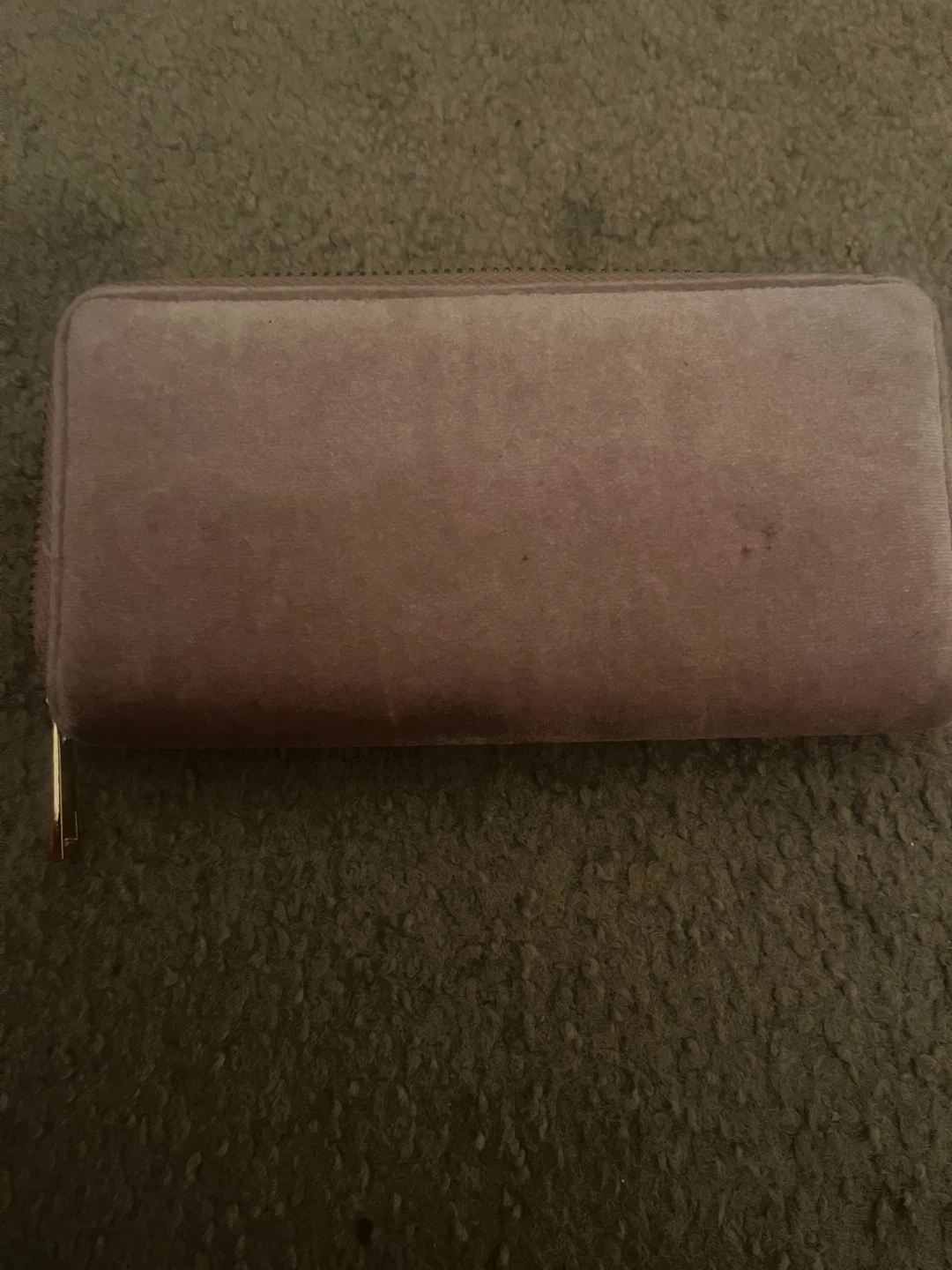 A soft pink velvet wallet with a zip-around closure. It has multiple card slots and a zippered coin pocket inside. Great for organizing your essentials!