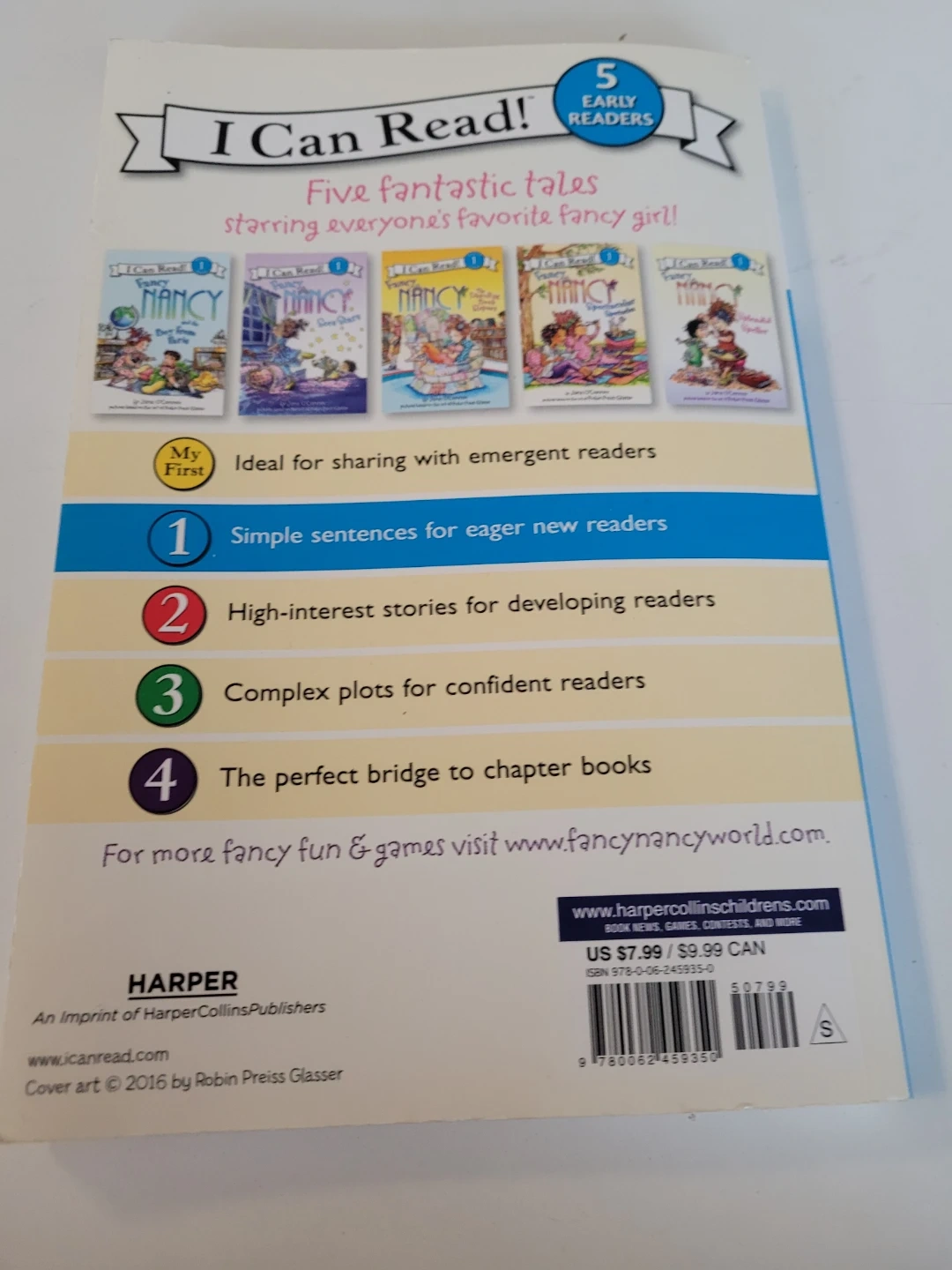 Selling a Fancy Nancy Story Collection book by Jane O'Connor. It's part of the "I Can Read!" series and is great for early readers. The book features five fantastic tales starring everyone's favourite fancy girl! It's ideal for sharing with emergent readers and uses simple sentences for eager new readers. The cover art is from 2016