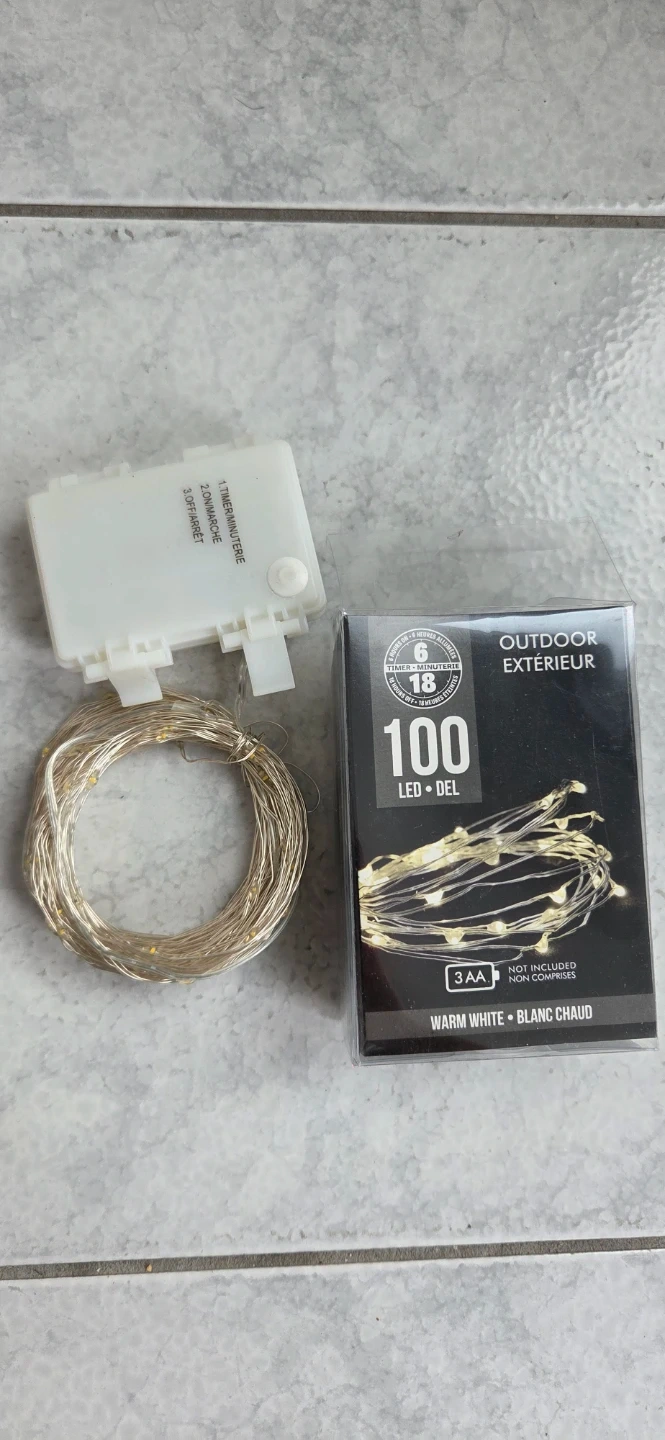 These outdoor LED string lights have 100 lights in a warm white colour. They feature a 6-hour timer and require 3 AA batteries, which are not included. Perfect for decorating your yard or patio for any occasion!