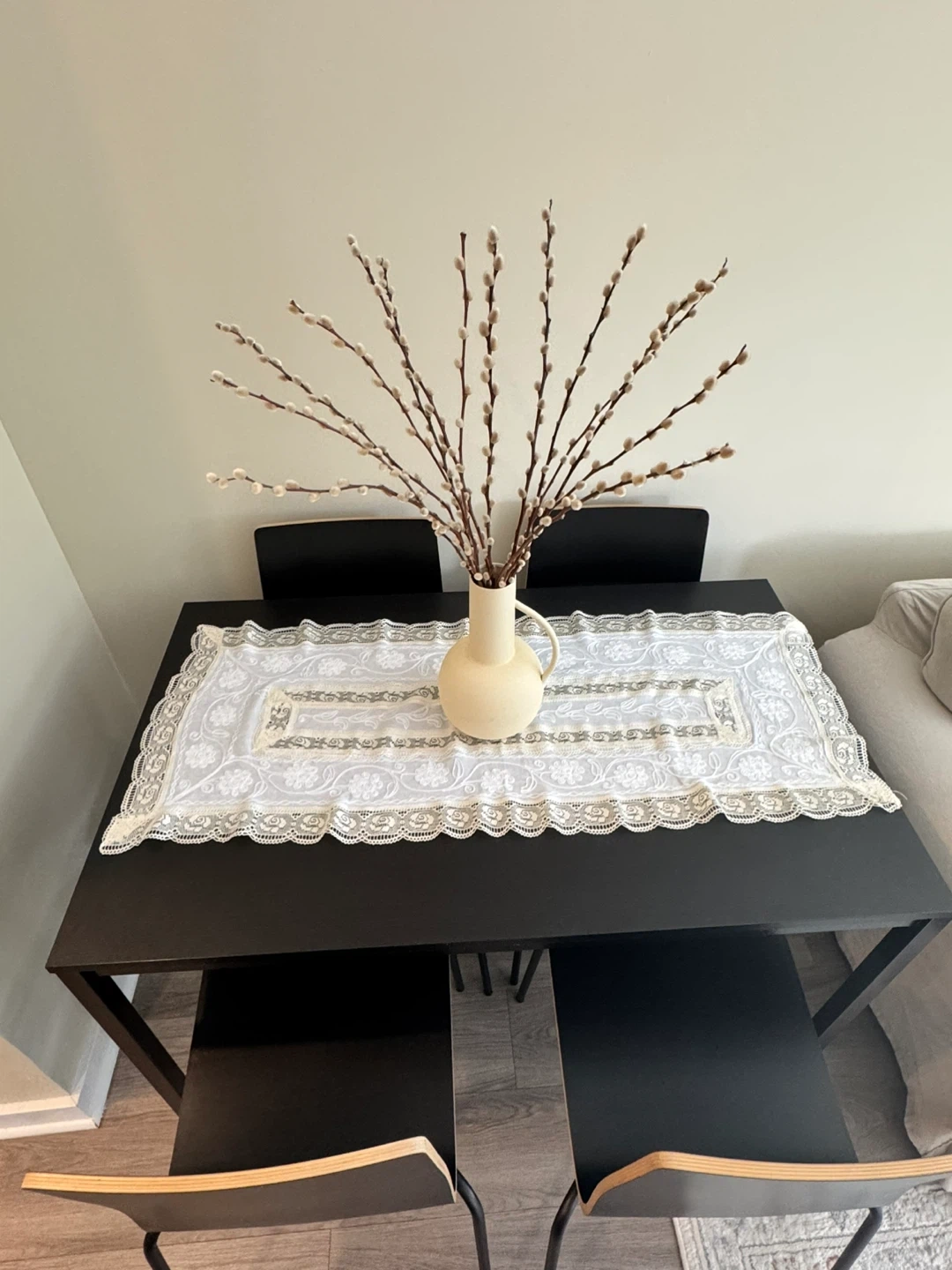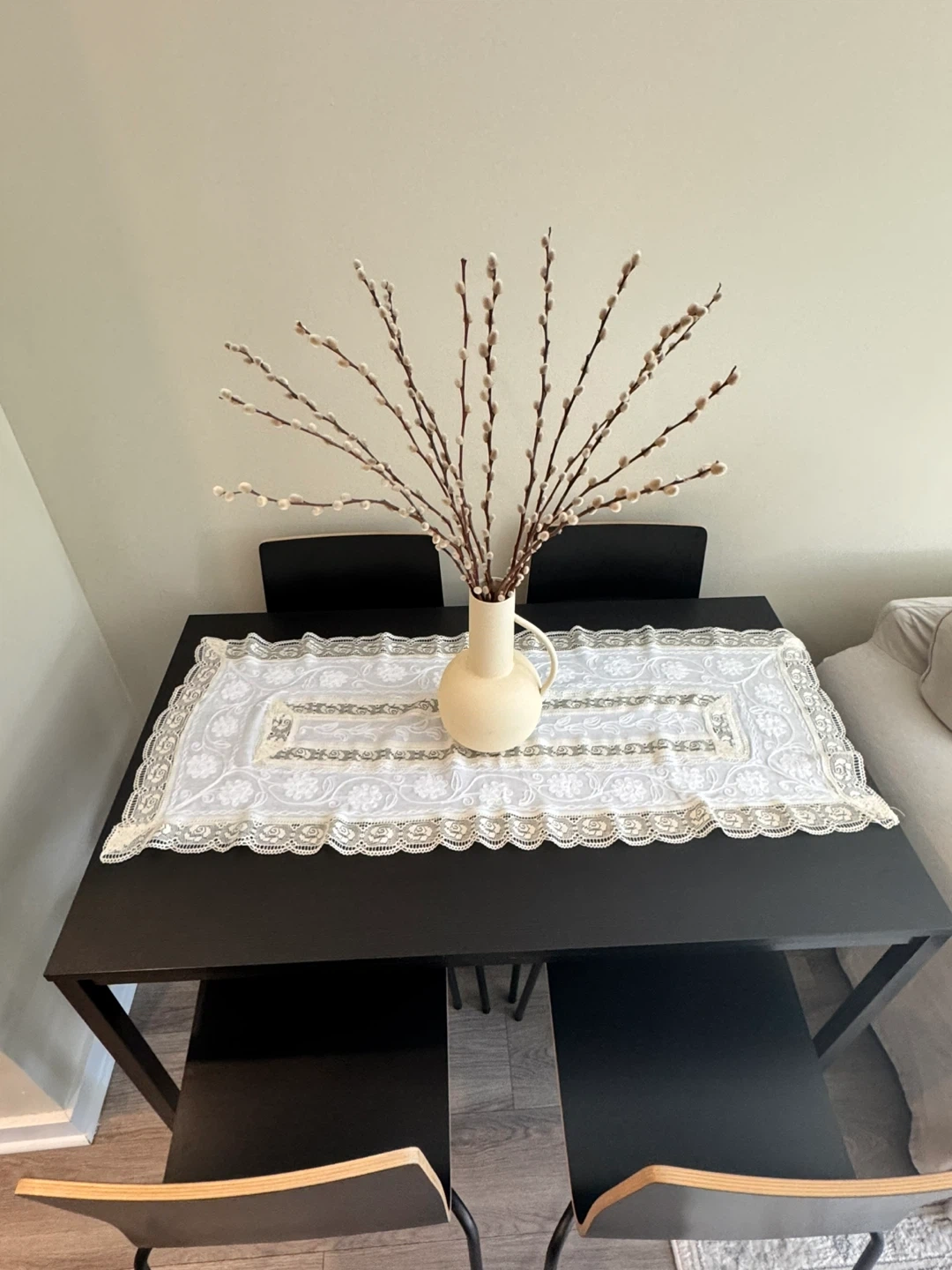 Cream ceramic pitcher vase. Includes decorative pussy willow branches. Adds a touch of rustic charm to any table setting. Perfect for entryway consoles or dining tables.