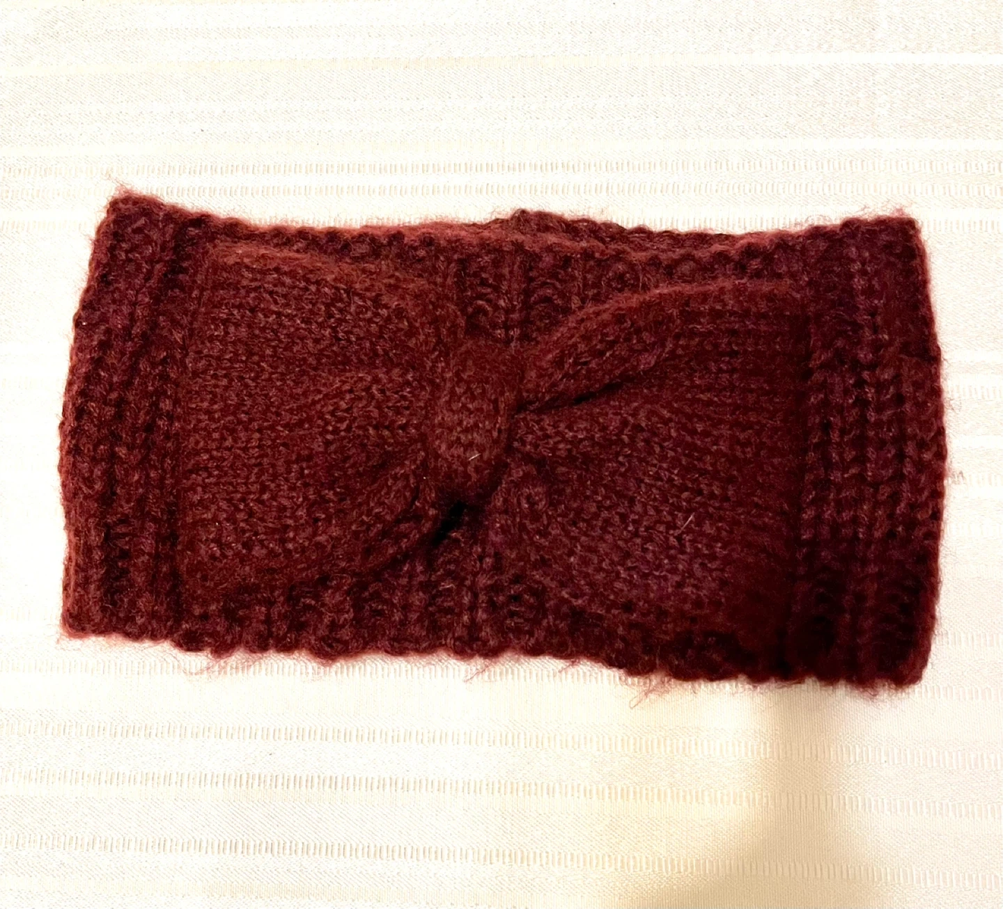 Cozy knitted headband in a deep burgundy colour. It's designed with a cute knotted bow at the front. Made from a soft, fuzzy yarn, it'll keep your ears warm on chilly days. One size fits most. Excellent condition.