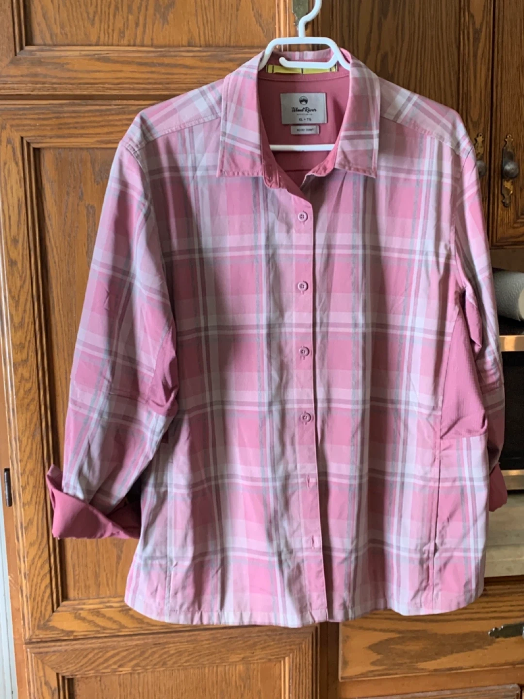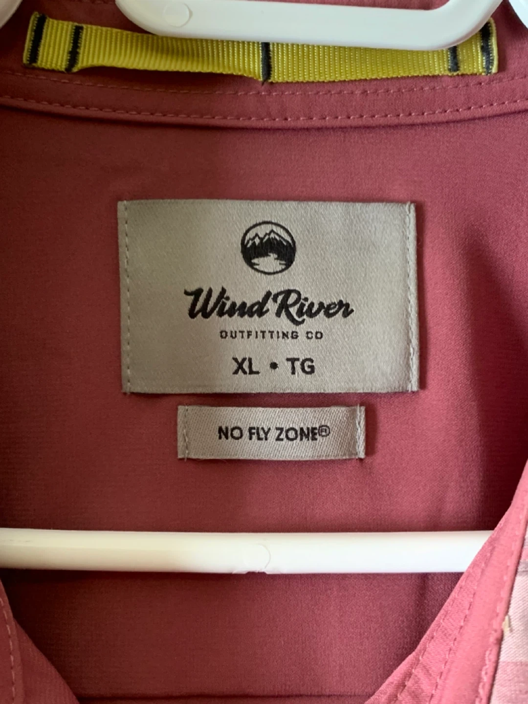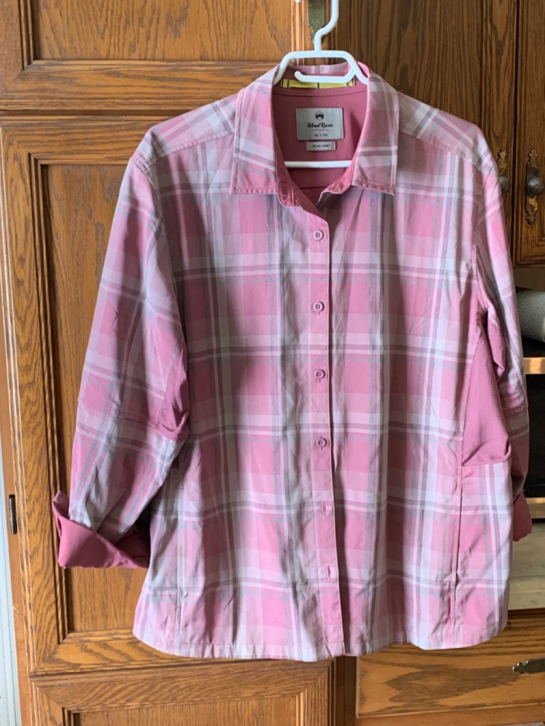 Hardly worn. Wind River Outfitting Co. long sleeve button-up shirt. Features "No Fly Zone" technology. Size XL, TG. Pink plaid pattern.