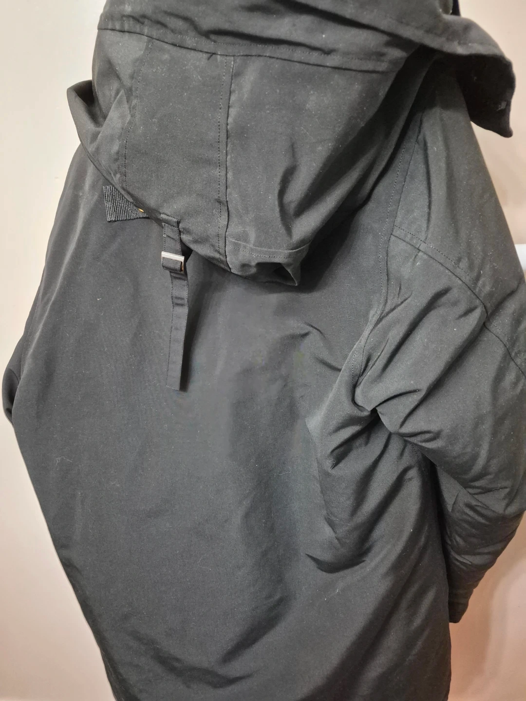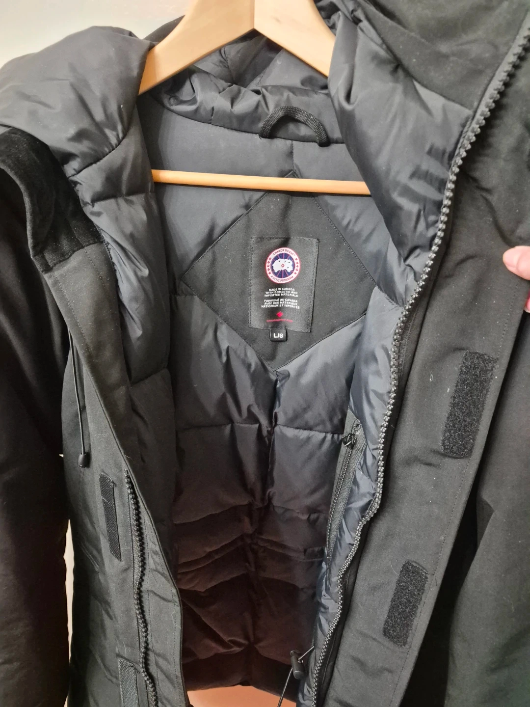 This is a black Canada Goose parka jacket. It's a size L. It's made with a durable outer shell and insulated for warmth.