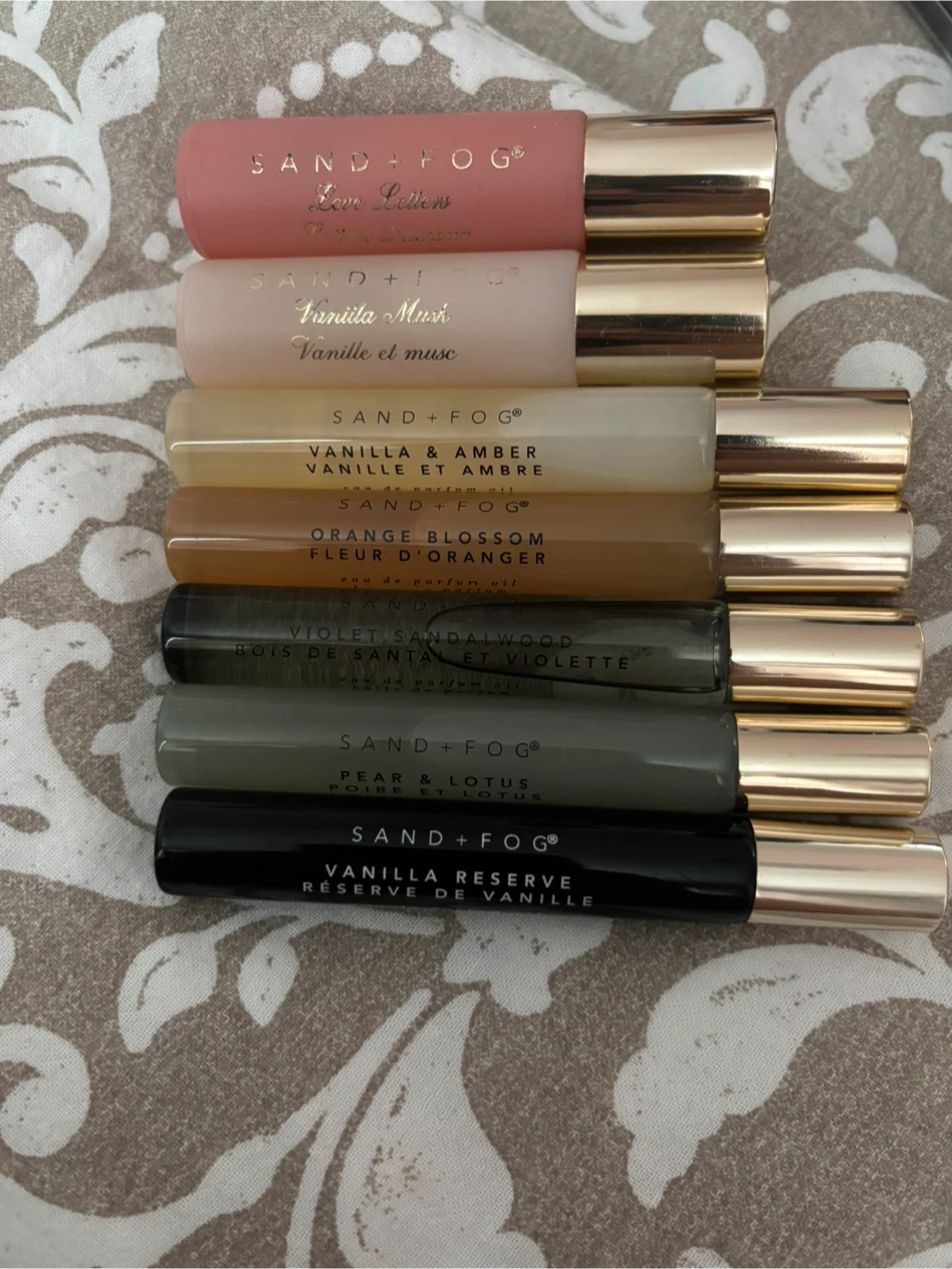 This is a collection of 7 Sand + Fog rollerball perfumes. Scents include Love Letters, Vanilla Musk, Vanilla & Amber, Orange Blossom, Violet Sandalwood, Pear & Lotus, and Vanilla Reserve. Each is an eau de parfum oil.