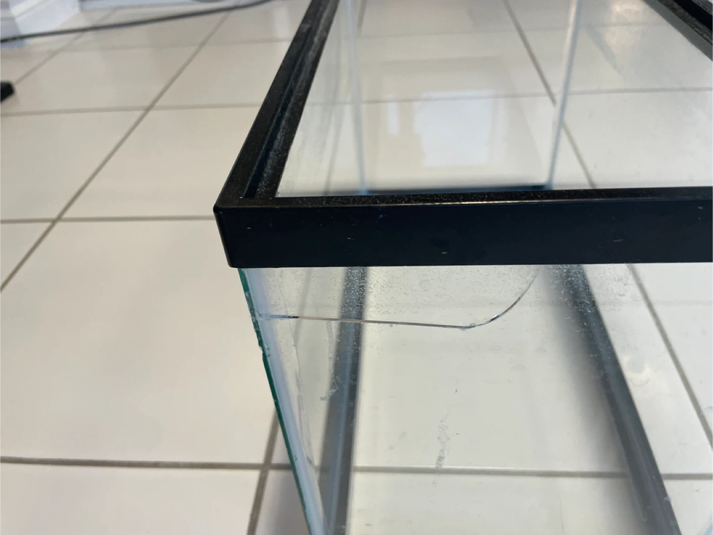 This is a standard glass aquarium tank with a black plastic rim. It's suitable for small fish or as a terrarium. The tank has a slight chip on one corner.