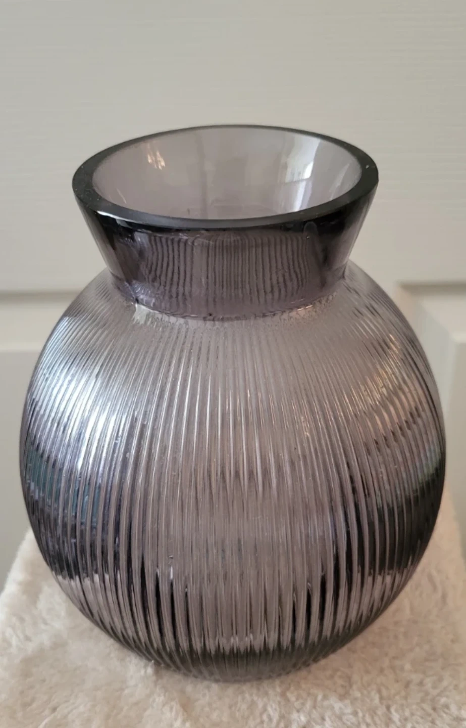 This is a lovely purple glass vase with a ribbed texture. It's a great accent piece for any room! Perfect for displaying flowers.