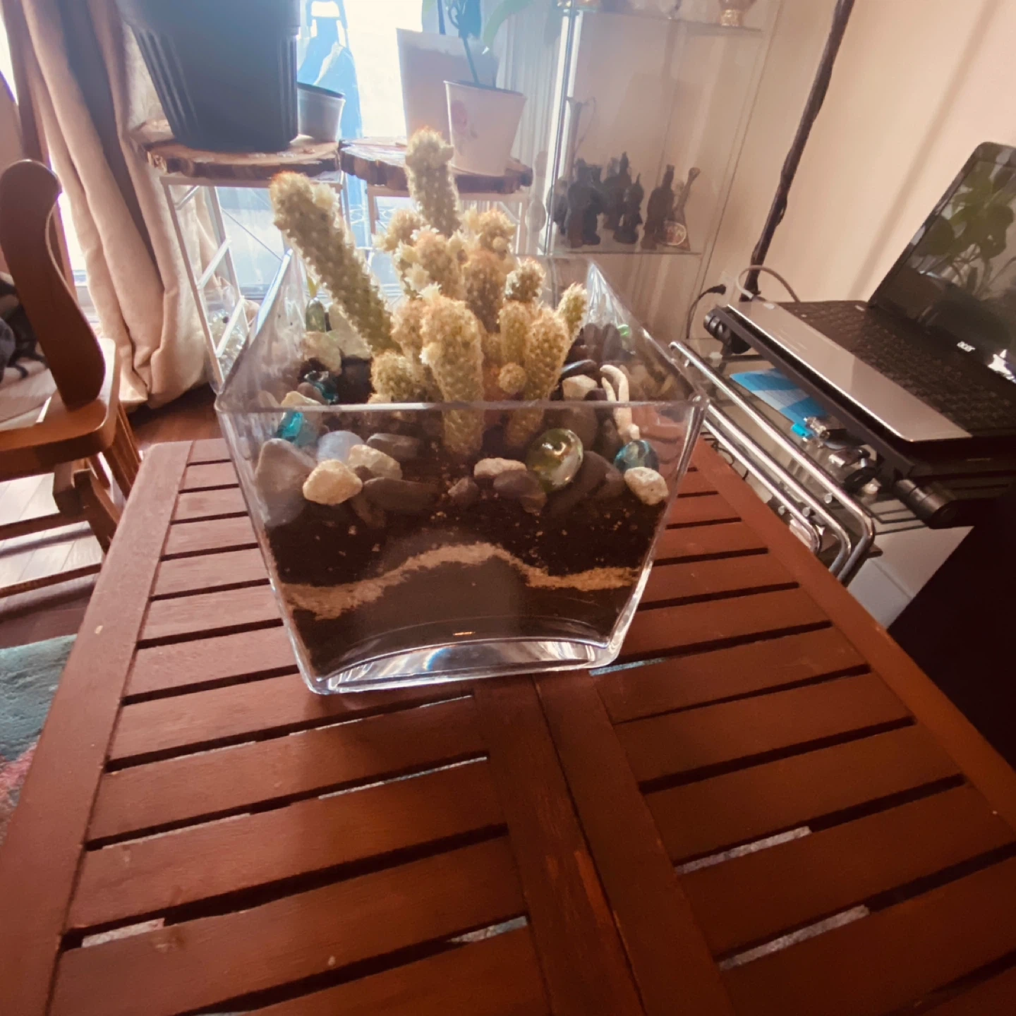 It's a cactus plant housed in a modern, square glass planter. The planter is filled with soil, sand, and decorative stones. This plant would be a great addition to any home or office space!