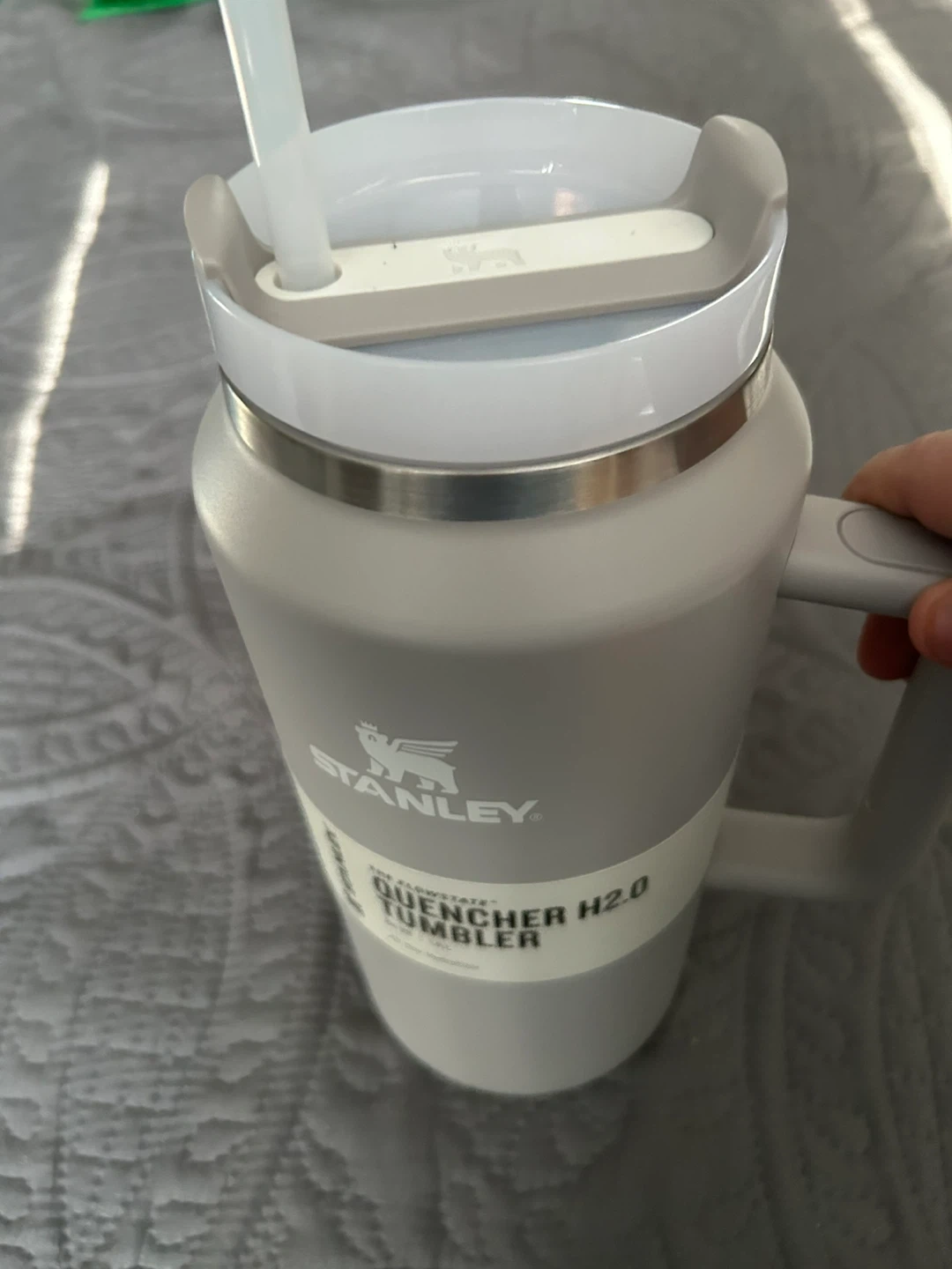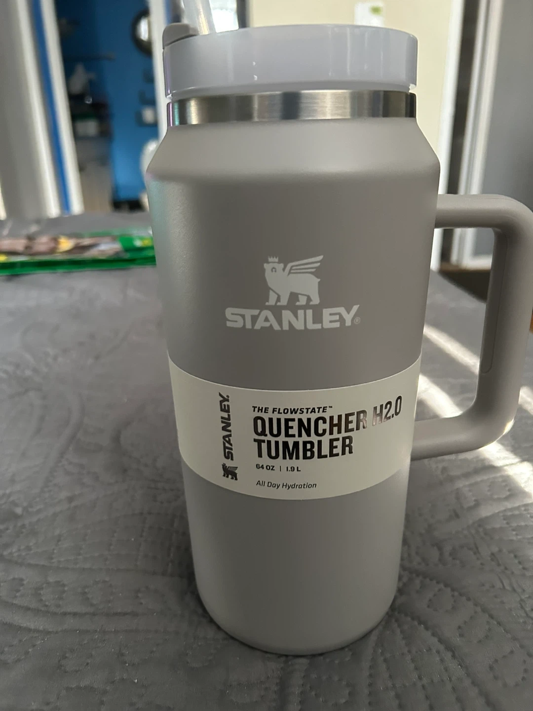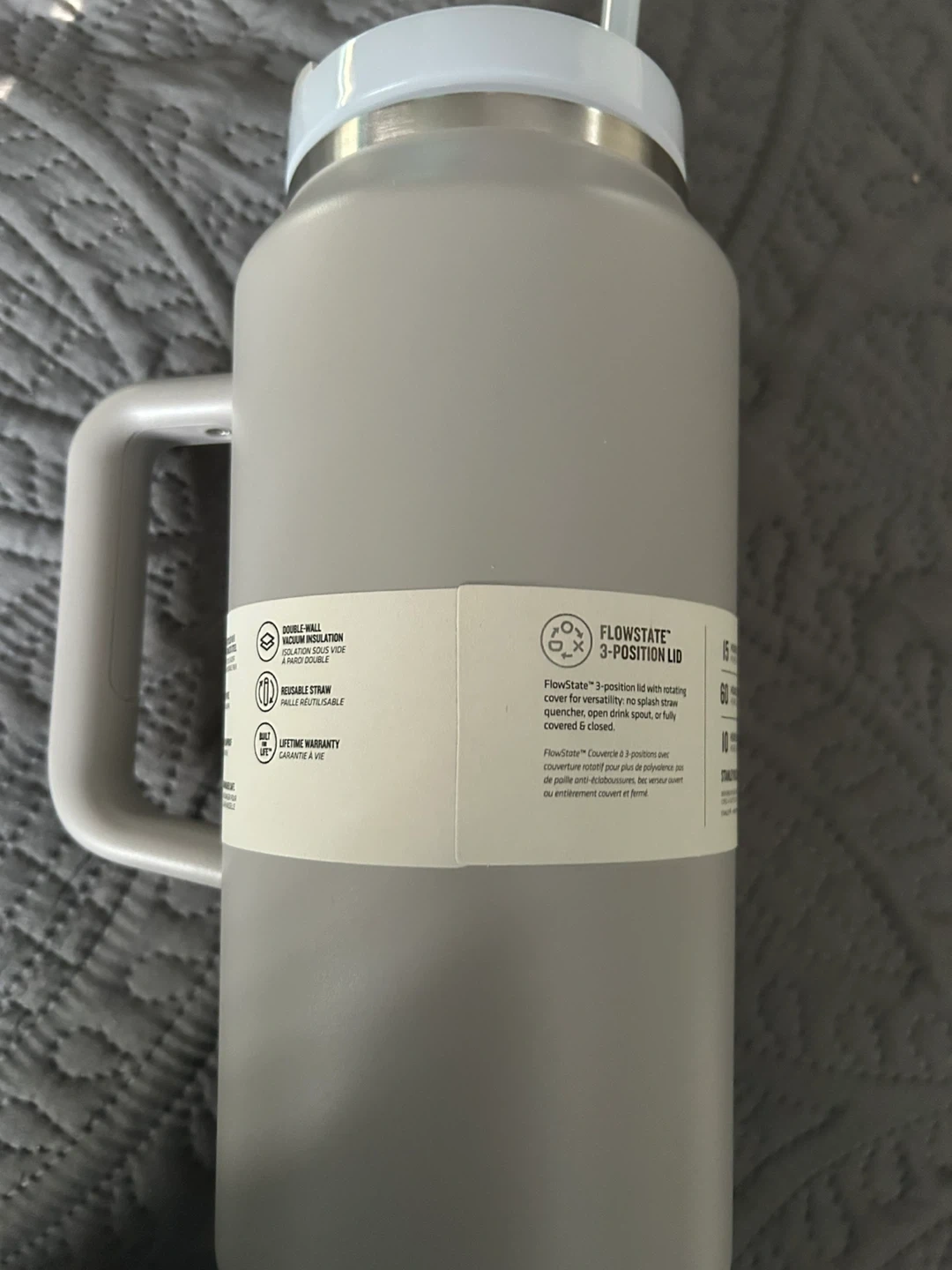 Mint condition, never used—still has original tags, reusable straw, and instructions booklet inside! Matte Ash Grey finish, huge 64 oz capacity (1.9L), FlowState 3-position lid (straw/open/closed—no spills), double-wall vacuum insulation for epic temp retention, comfy handle.